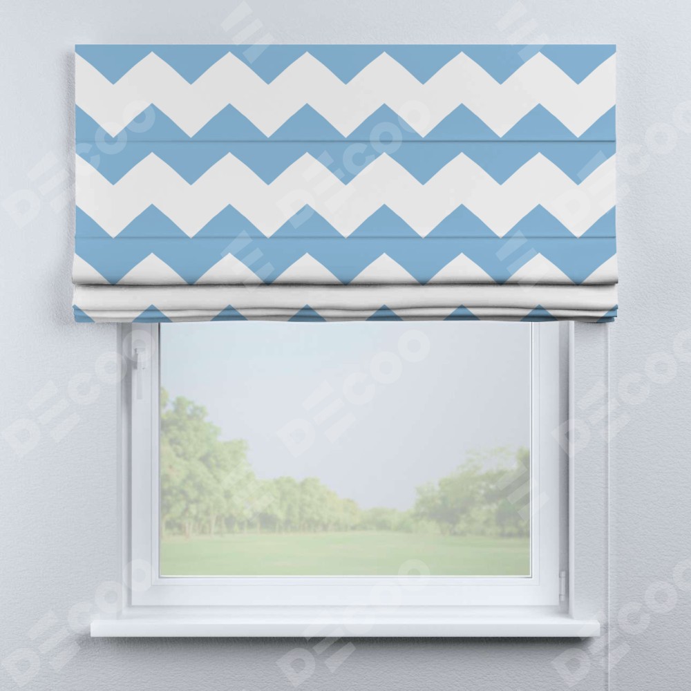Римская штора производителя «Cortin», используется для проёма, пошита из ткани блэкаут с нанесением сублимационной печати «Зигзаг крупный». Имеет универсальный механизм и подходит для монтажа: на потолок, на стену и в нишу.