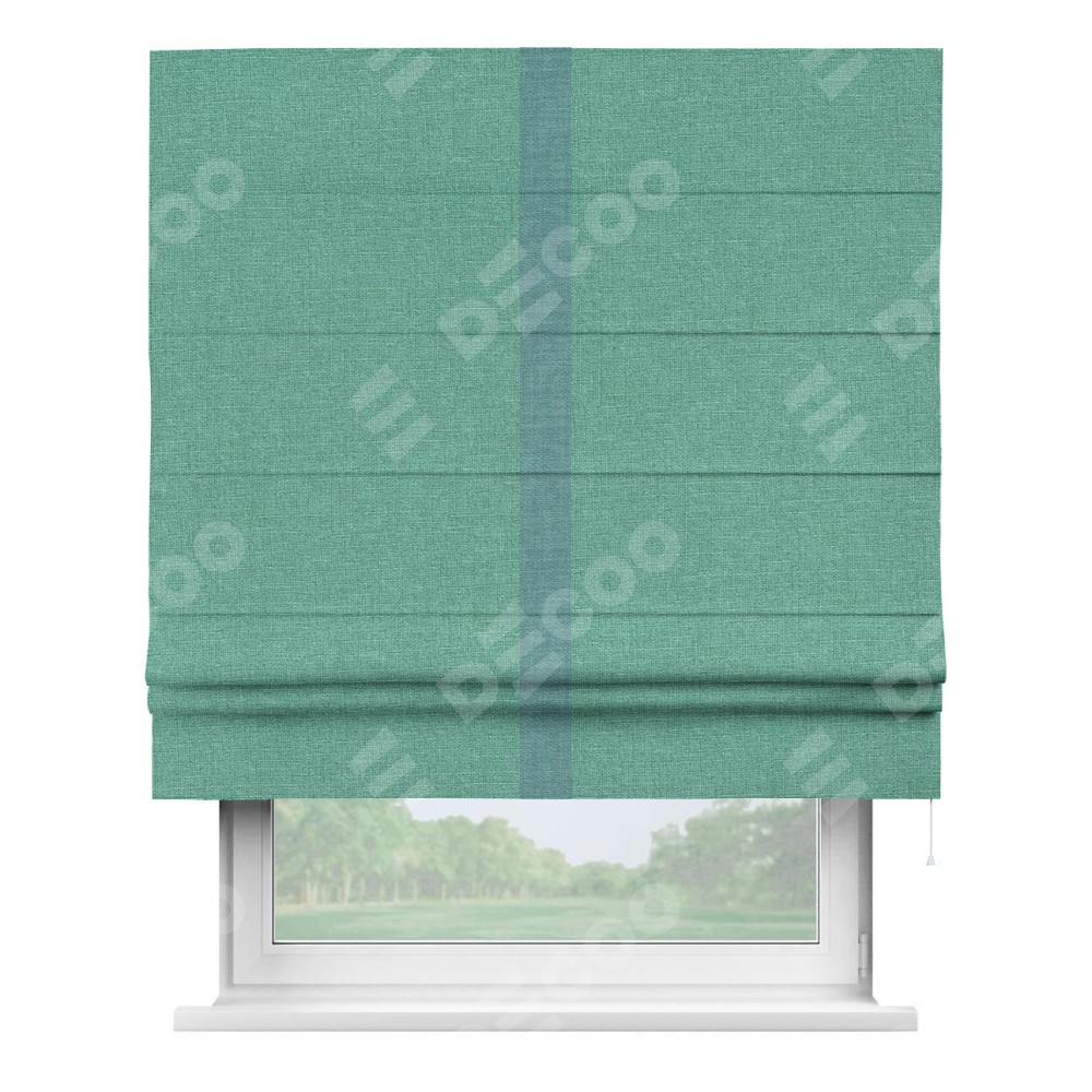 Римская штора производителя «Cortin», используется для проёма, пошита из ткани лён светло-бирюзовый, артикул 53435. Отделка шторы кантом «Хайвэй», ткань для канта используется из льна разной расцветки на выбор. Имеет универсальный механизм и подходит для монтажа: на потолок, на стену и в нишу.