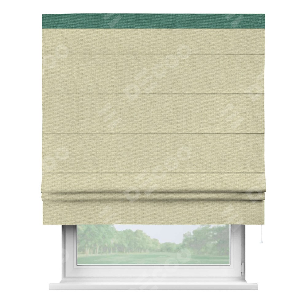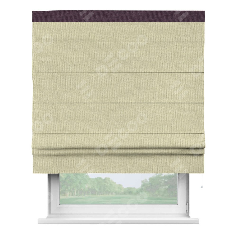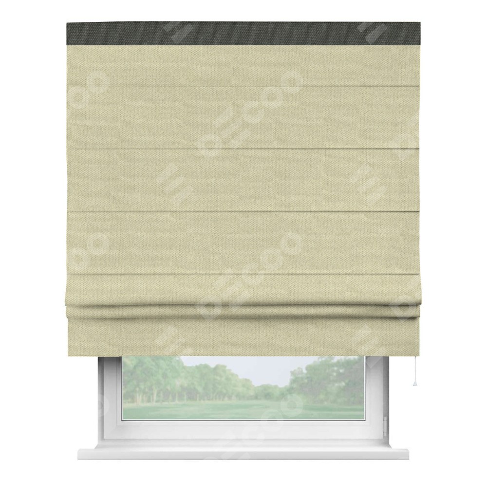 Римская штора производителя «Cortin», используется для проёма, пошита из ткани лён димаут шампань, артикул 90994. Отделка шторы кантом «Кинг», ткань для канта используется из льна димаут разной расцветки на выбор. Имеет универсальный механизм и подходит для монтажа: на потолок, на стену и в нишу.