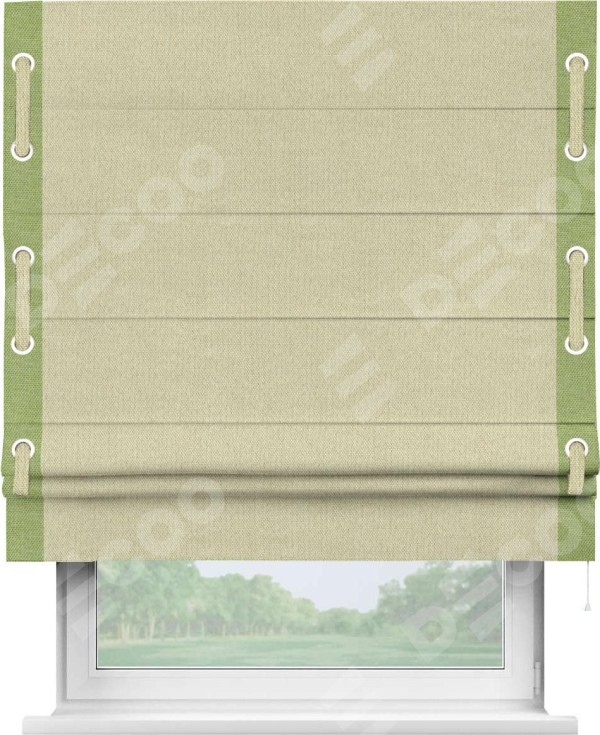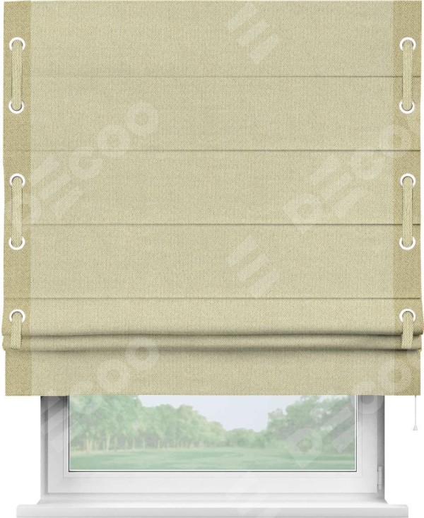 Римская штора производителя «Cortin», используется для проёма, пошита из ткани лён димаут шампань, артикул 90994. Отделка шторы кантом «Стрим Дуо» на кантах расположены люверсы с пояском, ткань для канта используется лён димаут разной расцветки на выбор. Ткань для пояска обычно используется из основной ткани шторы, а так же можно сделать из любой расцветки по желанию. Имеет универсальный механизм и подходит для монтажа: на потолок, на стену и в нишу.
