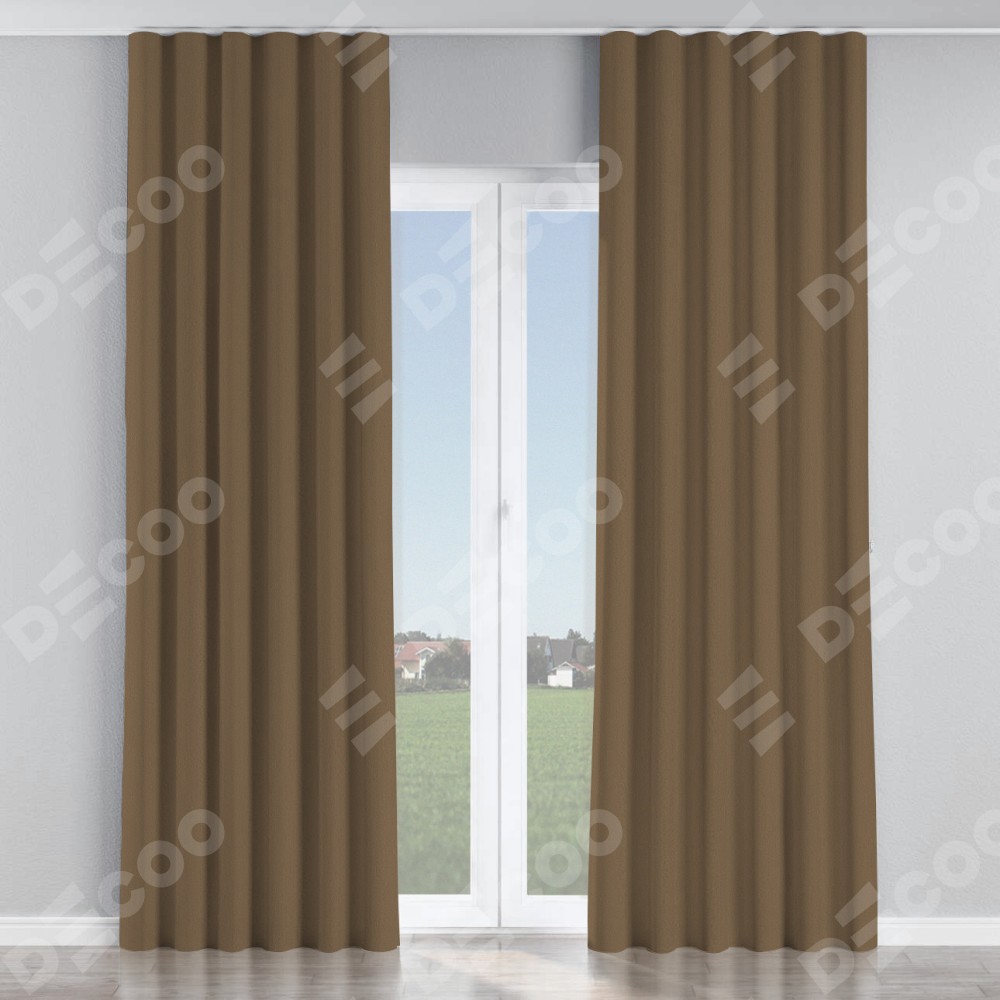 Комплект прямых штор, от производителя «Cortin», пошиты из ткани блэкаут однотонный коричневый, артикул ткани 91334. С изнаночной стороны в верхней части штор пристрачивается шторная лента с декоративными складками «Волна». Для создания элегантных складок прямые шторы шьются по стандарту с коэффициентом 1:2 (на 100 см. ширины проёма 200 см. ширины ткани).
