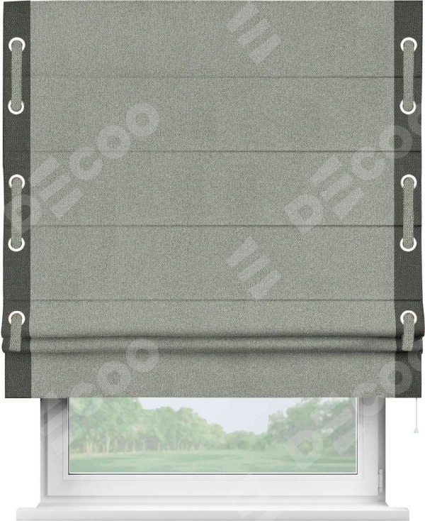 Римская штора производителя «Cortin», используется для проёма, пошита из ткани лён димаут серый, артикул 91009. Отделка шторы кантом «Стрим Дуо» на кантах расположены люверсы с пояском, ткань для канта используется лён димаут разной расцветки на выбор. Ткань для пояска обычно используется из основной ткани шторы, а так же можно сделать из любой расцветки по желанию. Имеет универсальный механизм и подходит для монтажа: на потолок, на стену и в нишу.