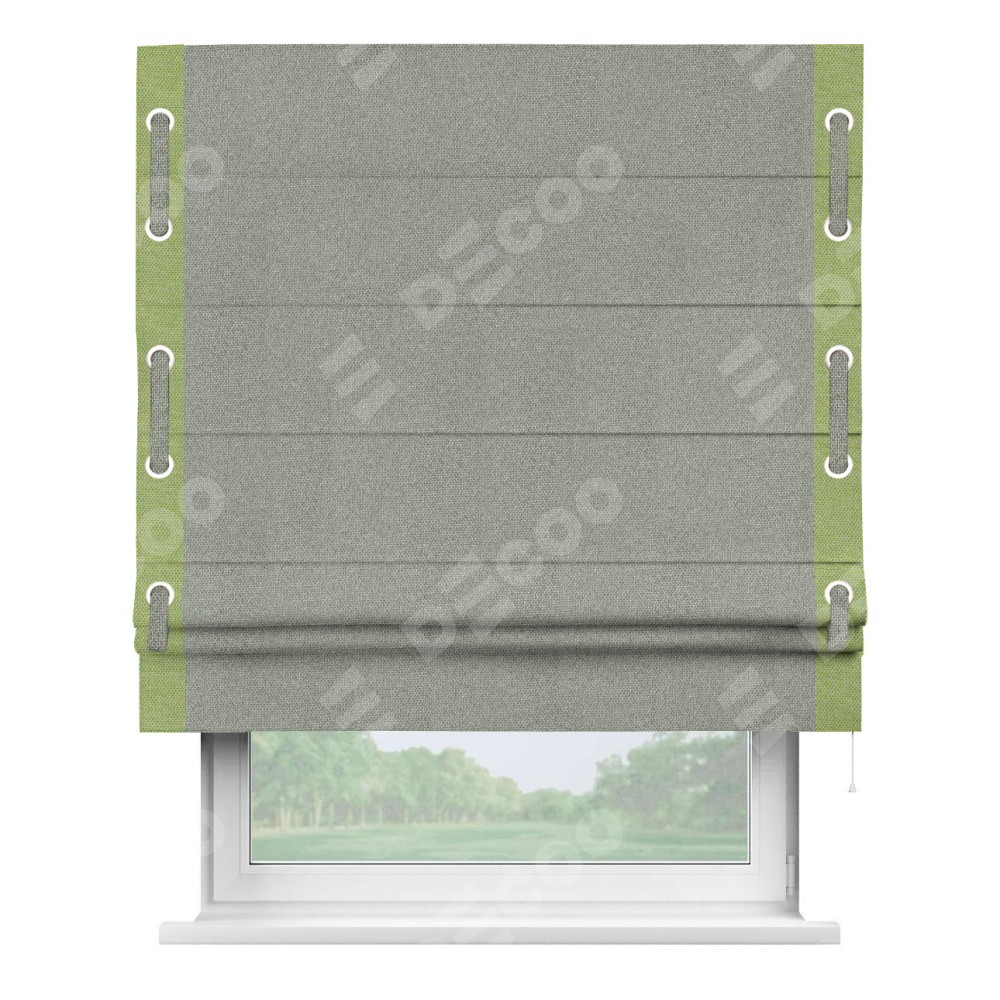 Римская штора «Кортин» для проема, лён димаут серый с кантом Стрим Дуо (люверсы с пояском)