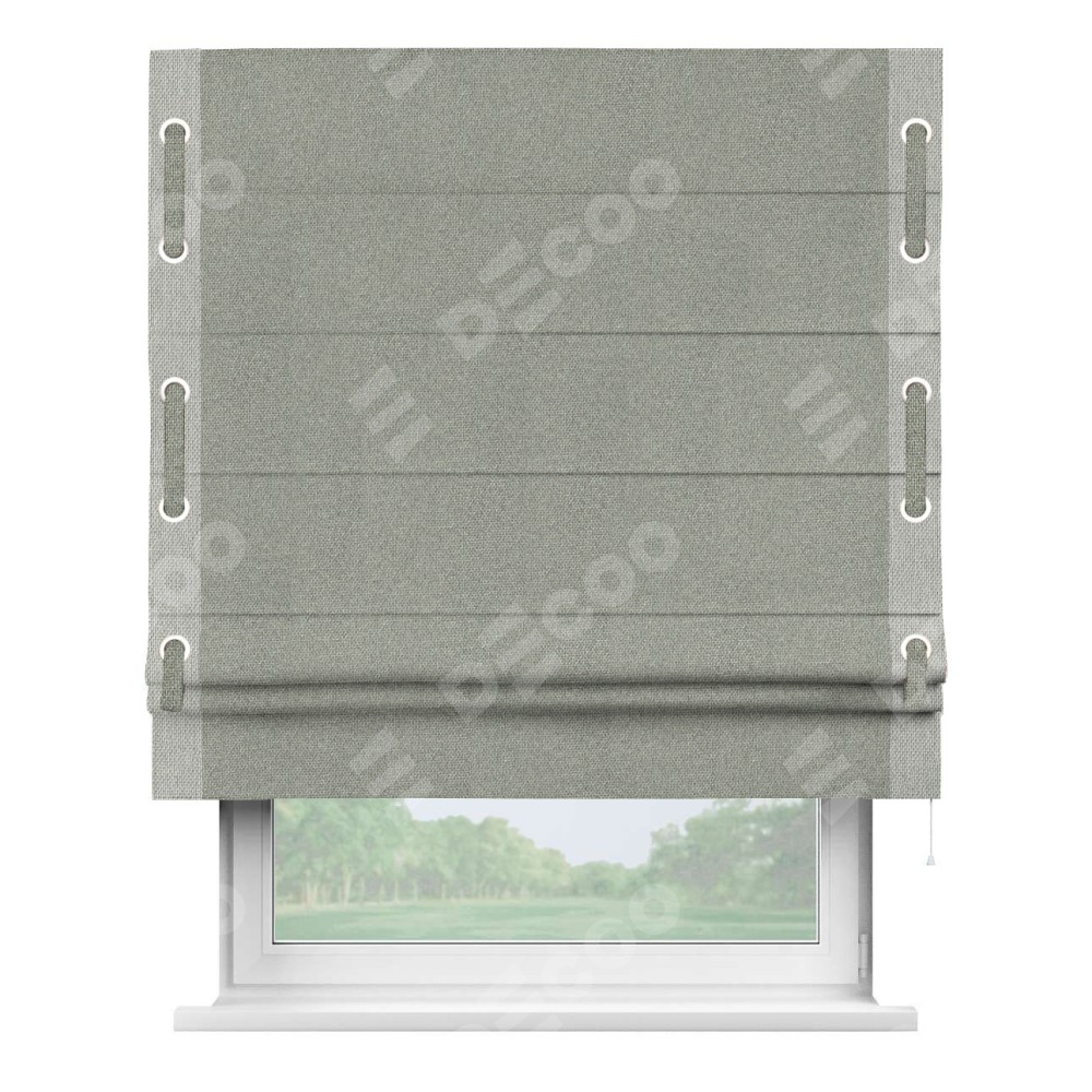 Римская штора производителя «Cortin», используется для проёма, пошита из ткани лён димаут серый, артикул 91009. Отделка шторы кантом «Стрим Дуо» на кантах расположены люверсы с пояском, ткань для канта используется лён димаут разной расцветки на выбор. Ткань для пояска обычно используется из основной ткани шторы, а так же можно сделать из любой расцветки по желанию. Имеет универсальный механизм и подходит для монтажа: на потолок, на стену и в нишу.
