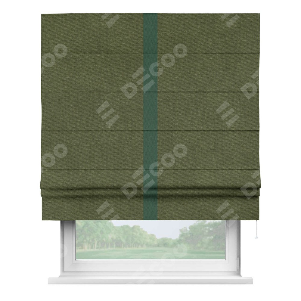 Римская штора производителя «Cortin», используется для проёма, пошита из ткани лён димаут салатовый, артикул 91002. Отделка шторы кантом «Хайвэй», ткань для канта используется из льна димаут разной расцветки на выбор. Имеет универсальный механизм и подходит для монтажа: на потолок, на стену и в нишу.