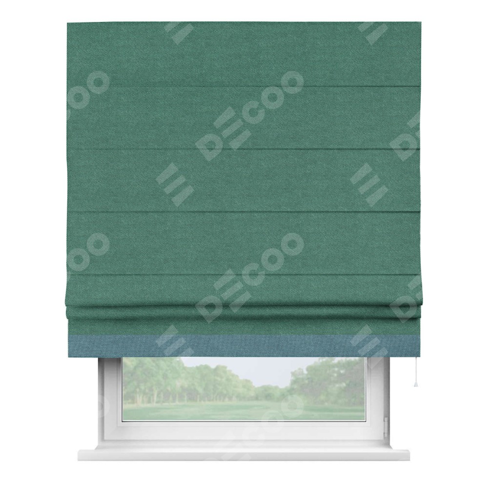Римская штора производителя «Cortin», используется для проёма, пошита из ткани лён димаут светло-бирюзовый, артикул 91005. Отделка шторы кантом «Джестер», ткань для канта используется из льна димаут разной расцветки на выбор. Имеет универсальный механизм и подходит для монтажа: на потолок, на стену и в нишу.