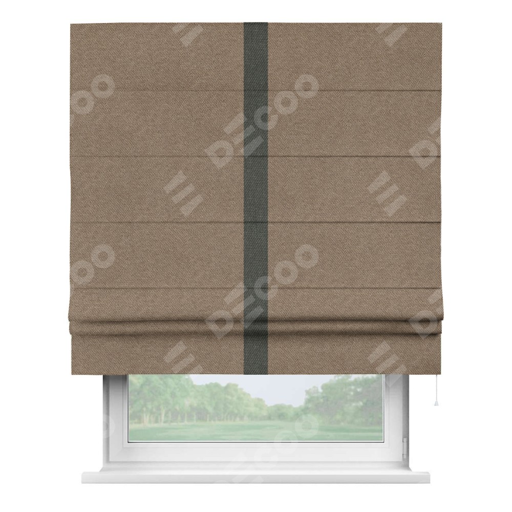Римская штора производителя «Cortin», используется для проёма, пошита из ткани лён димаут коричневый, артикул 90996. Отделка шторы кантом «Хайвэй», ткань для канта используется из льна димаут разной расцветки на выбор. Имеет универсальный механизм и подходит для монтажа: на потолок, на стену и в нишу.