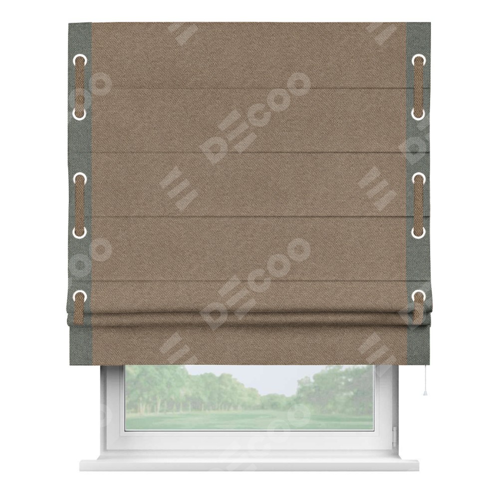 Римская штора производителя «Cortin», используется для проёма, пошита из ткани лён димаут коричневый, артикул 90996. Отделка шторы кантом «Стрим Дуо» на кантах расположены люверсы с пояском, ткань для канта используется лён димаут разной расцветки на выбор. Ткань для пояска обычно используется из основной ткани шторы, а так же можно сделать из любой расцветки по желанию. Имеет универсальный механизм и подходит для монтажа: на потолок, на стену и в нишу.