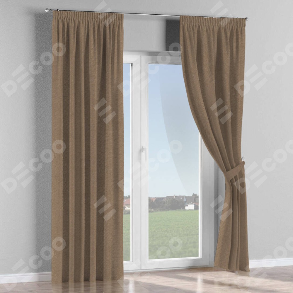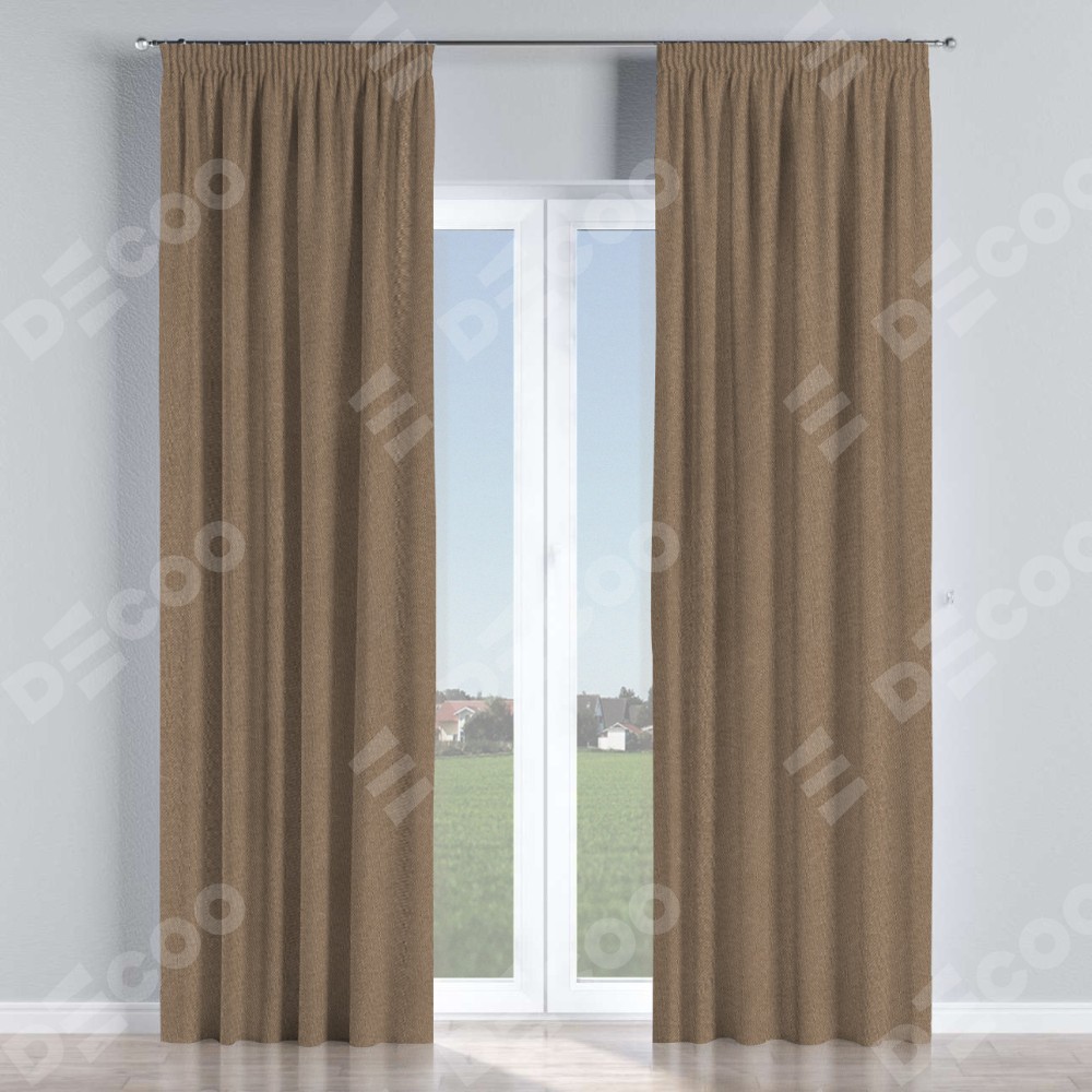 Комплект прямых штор, от производителя «Cortin», пошиты из ткани лён димаут коричневый, артикул ткани 90996. С изнаночной стороны в верхней части штор пристрачивается шторная лента с декоративными складками «Карандаш». Для создания элегантных складок прямые шторы шьются по стандарту с коэффициентом 1:2 (на 100 см. ширины проёма 200 см. ширины ткани).
