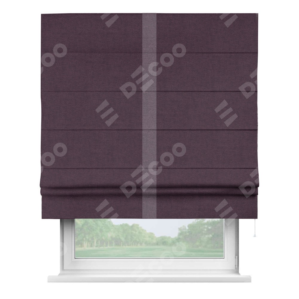 Римская штора производителя «Cortin», используется для проёма, пошита из ткани лён димаут фиолетовый, артикул 16267. Отделка шторы кантом «Хайвэй», ткань для канта используется из льна димаут разной расцветки на выбор. Имеет универсальный механизм и подходит для монтажа: на потолок, на стену и в нишу.