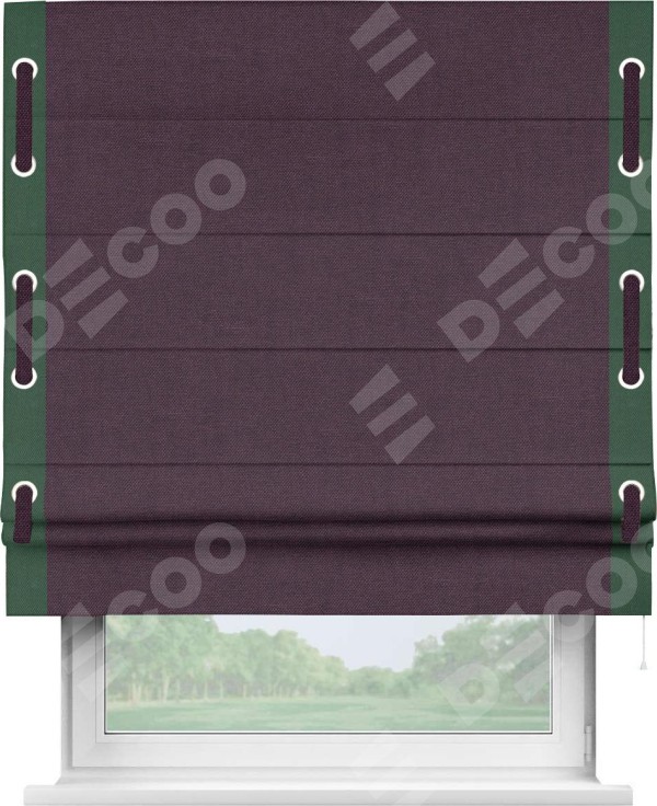 Римская штора производителя «Cortin», используется для проёма, пошита из ткани лён димаут фиолетовый, артикул 16267. Отделка шторы кантом «Стрим Дуо» на кантах расположены люверсы с пояском, ткань для канта используется лён димаут разной расцветки на выбор. Ткань для пояска обычно используется из основной ткани шторы, а так же можно сделать из любой расцветки по желанию. Имеет универсальный механизм и подходит для монтажа: на потолок, на стену и в нишу.