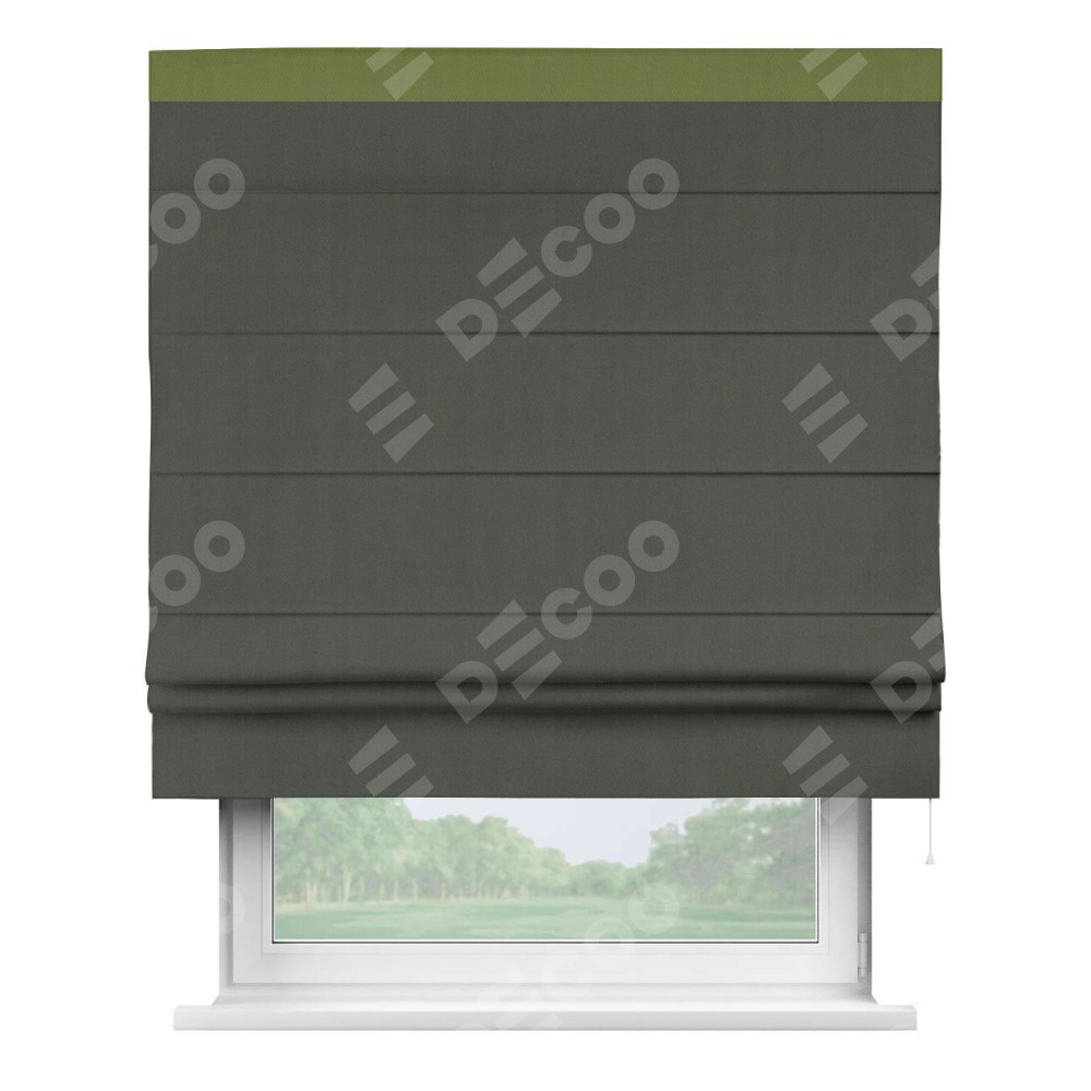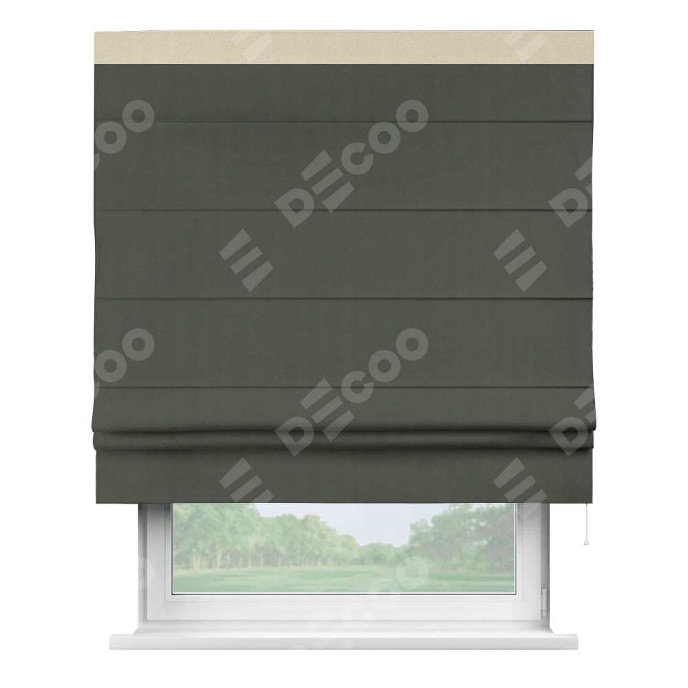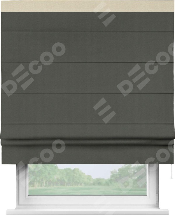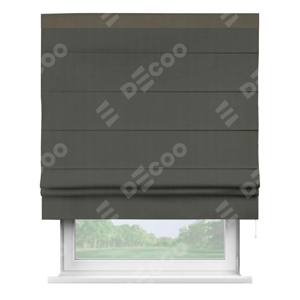Римская штора производителя «Cortin», используется для проёма, пошита из ткани блэкаут однотонный дымчато-серый, артикул ткани 91571−1. Отделка шторы кантом «Кинг», ткань для канта используется из блэкаута однотонного разной расцветки на выбор. Имеет универсальный механизм и подходит для монтажа: на потолок, на стену и в нишу.