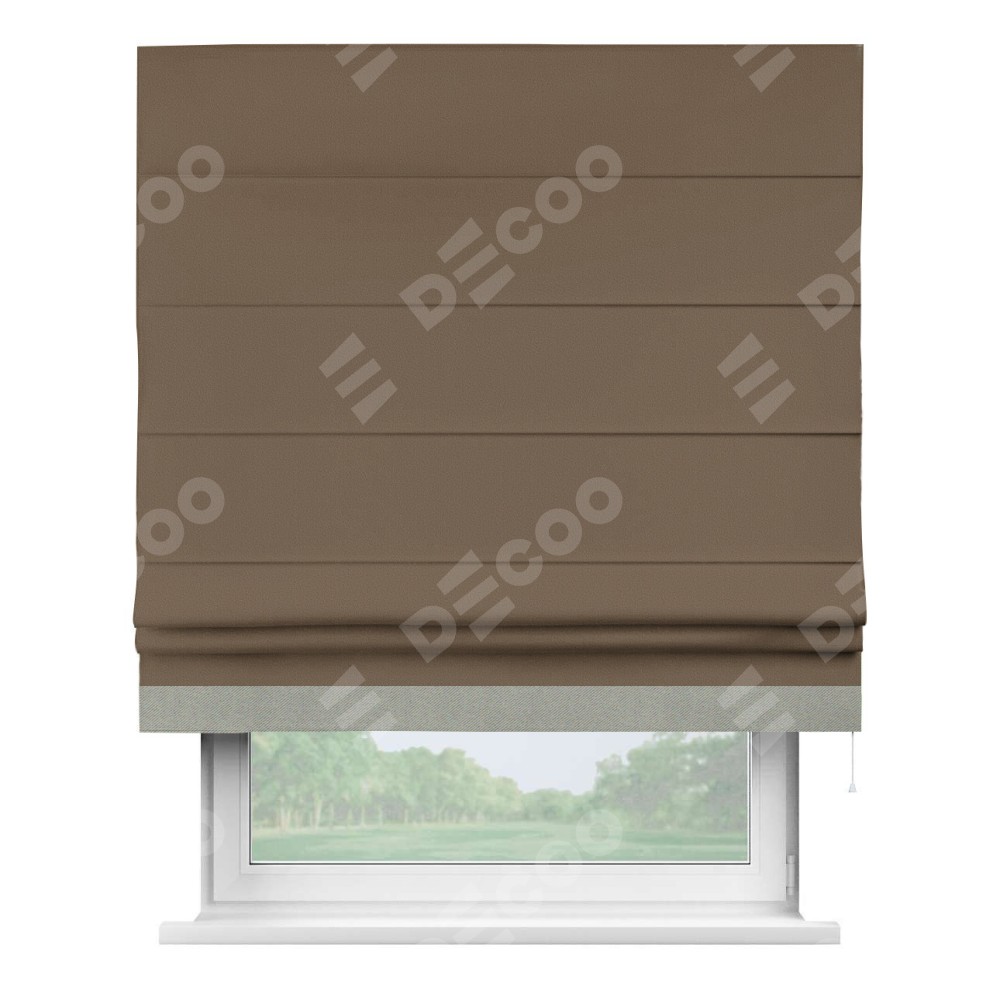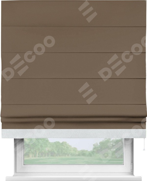 Римская штора производителя «Cortin», используется для проёма, пошита из ткани блэкаут однотонный коричневый, артикул ткани 91334. Отделка шторы кантом «Джестер», ткань для канта используется из блэкаута однотонного разной расцветки на выбор. Имеет универсальный механизм и подходит для монтажа: на потолок, на стену и в нишу.