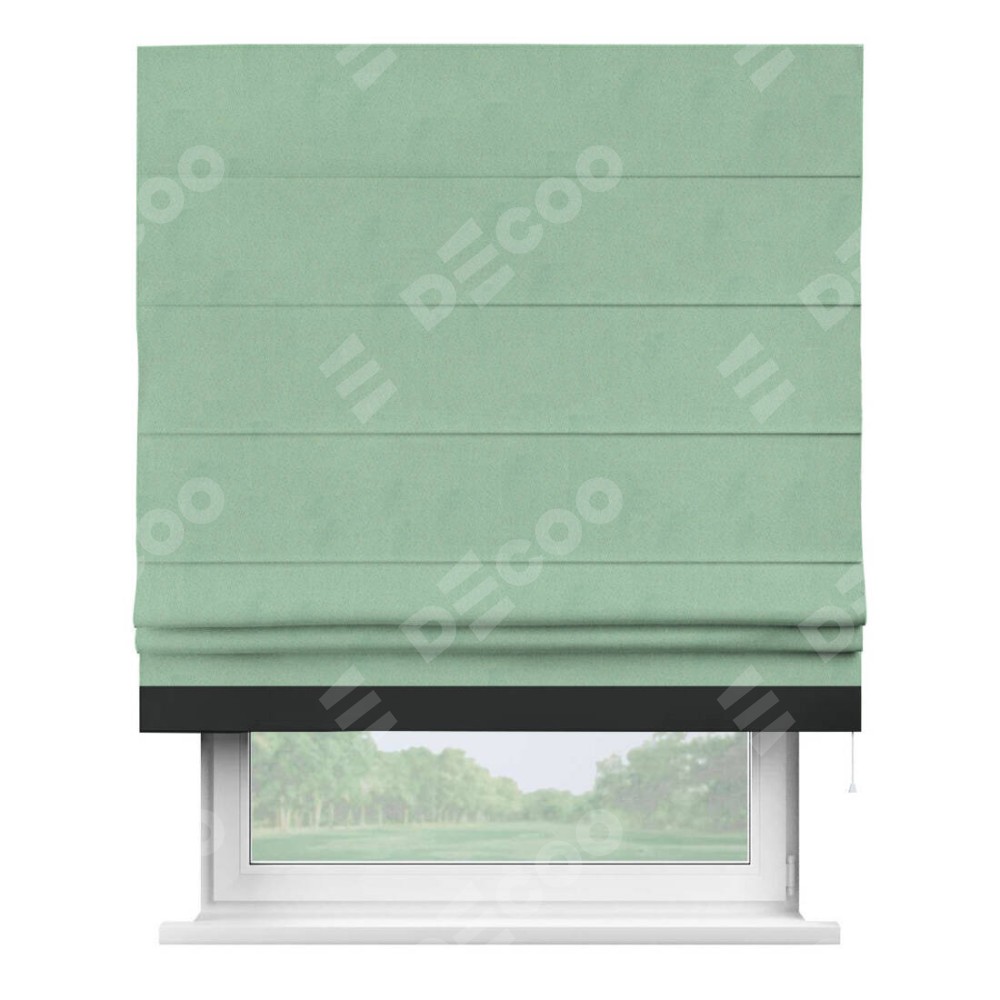 Римская штора производителя «Cortin», используется для проёма, пошита из ткани блэкаут однотонный ментоловый, артикул ткани 91572−1. Отделка шторы кантом «Джестер», ткань для канта используется из блэкаута однотонного разной расцветки на выбор. Имеет универсальный механизм и подходит для монтажа: на потолок, на стену и в нишу.