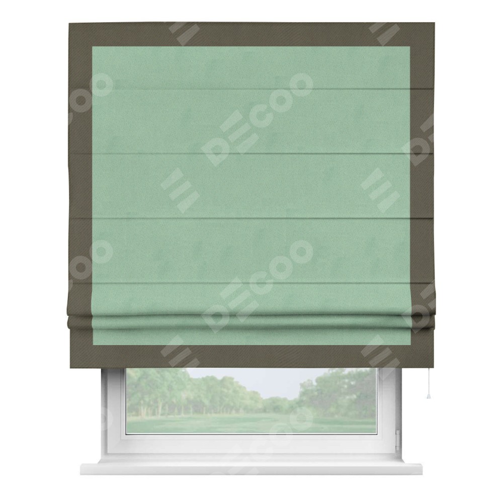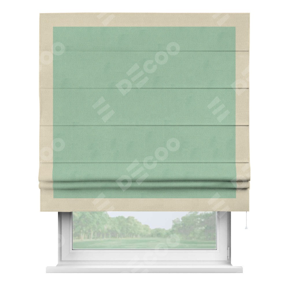 Римская штора производителя «Cortin», используется для проёма, пошита из ткани блэкаут однотонный ментоловый, артикул ткани 91572−1. Отделка шторы кантом «Чесс», ткань для канта используется из блэкаута однотонного разной расцветки на выбор. Имеет универсальный механизм и подходит для монтажа: на потолок, на стену и в нишу.