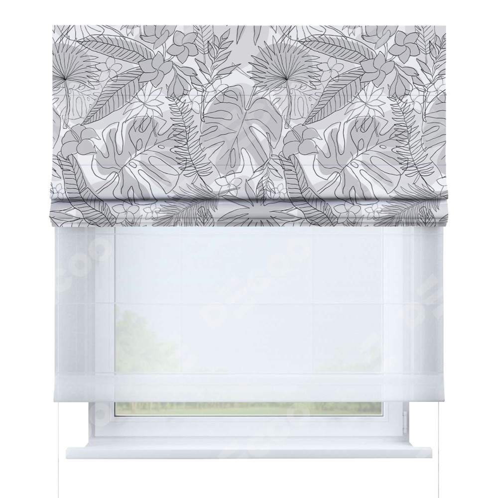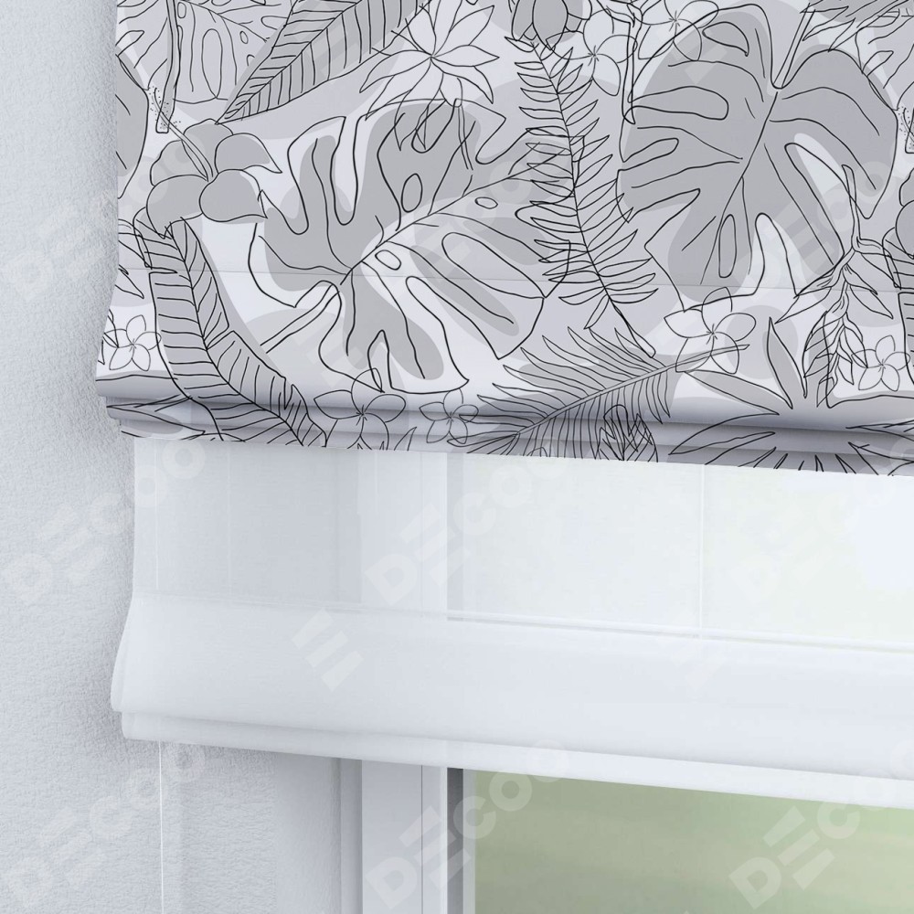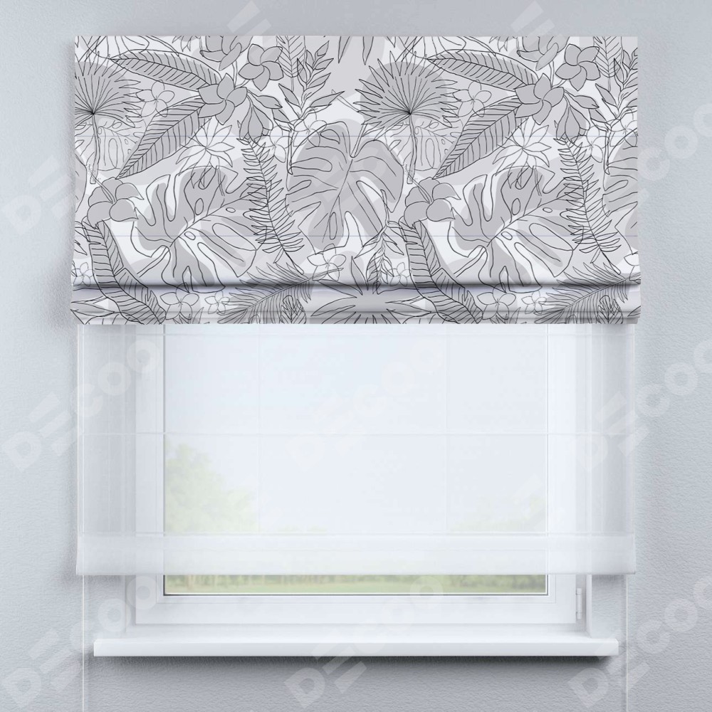 Двойная римская штора «День-ночь» от производителя Cortin предназначена для использования в проёмах. Эта штора уникальна тем, что состоит из двух полотен. На лицевой стороне находится блэкаут с нанесением сублимационной печати «Тропический лес», обеспечивающий эффективное затемнение. В комплект также входит вторая ткань — легкий белый тюль (артикул: V-01), который добавляет изящества и легкости оформлению окна. Кроме того, доступны и другие разновидности ткани тюль, выбор которых доступен по  ссылке .