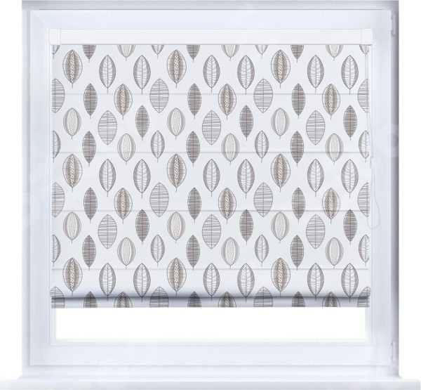 Римская штора производителя «Cortin», устанавливается на створку окна, пошита из ткани блэкаут с нанесением сублимационной печати «Кофейные листья». Штора шьётся по индивидуальным размерам, для данного типа римской шторы возможная ширина от 35 до 150 см., высота до 250 см.