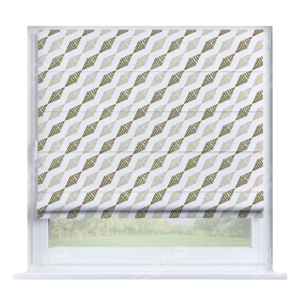 Римская штора производителя «Cortin», устанавливается на створку окна, пошита из ткани блэкаут с нанесением сублимационной печати «Диагональные ромбы». Штора шьётся по индивидуальным размерам, для данного типа римской шторы возможная ширина от 35 до 150 см., высота до 250 см.