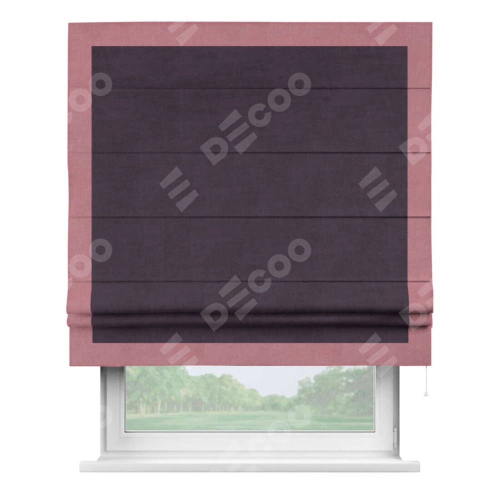 Римская штора производителя «Cortin», используется для проёма, пошита из ткани вельвет тёмно-фиолетовый, артикул ткани 72403. Отделка шторы кантом «Чесс», ткань для канта используется из вельвета разной расцветки на выбор. Имеет универсальный механизм и подходит для монтажа: на потолок, на стену и в нишу.
