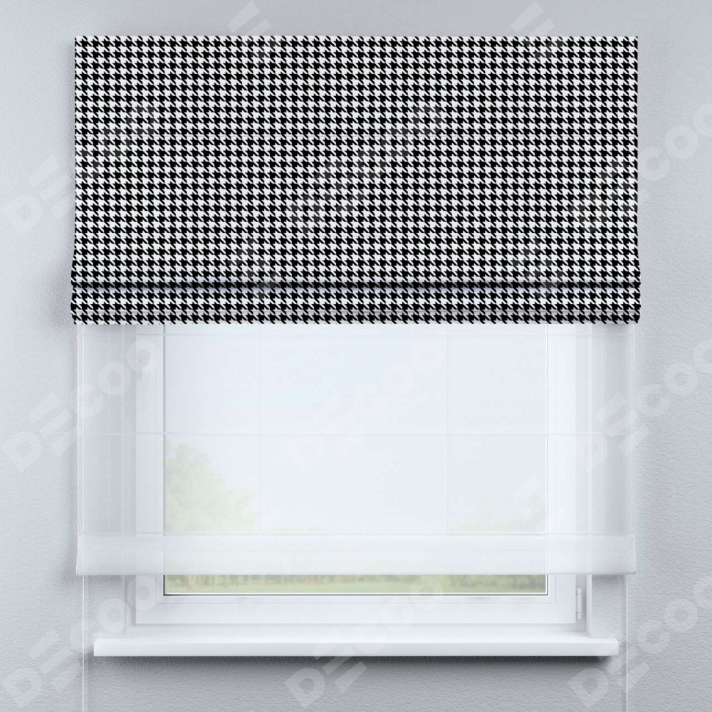 Двойная римская штора «День-ночь» от производителя Cortin предназначена для использования в проёмах. Эта штора уникальна тем, что состоит из двух полотен. На лицевой стороне находится блэкаут с нанесением сублимационной печати «Гусиные лапки» черно-белый», обеспечивающий эффективное затемнение. В комплект также входит вторая ткань — легкий белый тюль (артикул: V-01), который добавляет изящества и легкости оформлению окна. Кроме того, доступны и другие разновидности ткани тюль, выбор которых доступен по  ссылке .