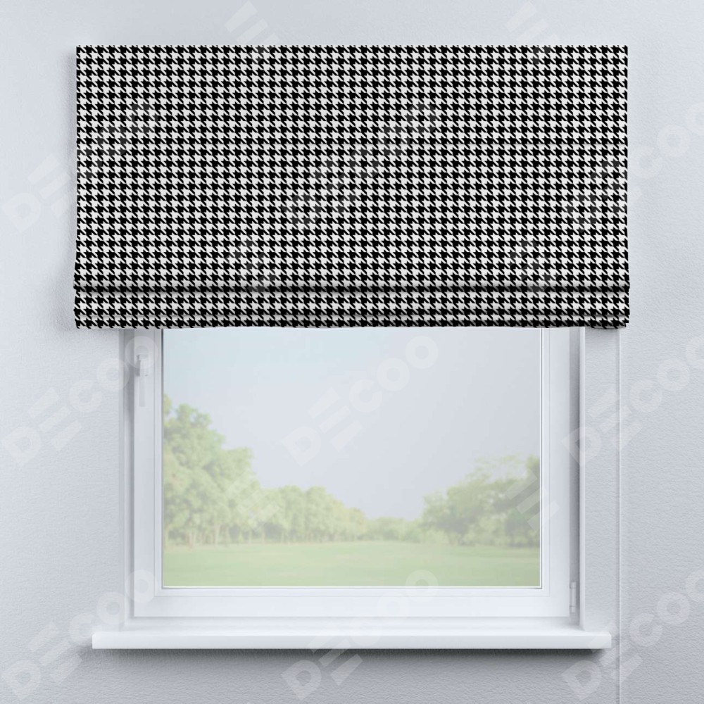 Классическая римская штора производителя «Cortin», пошита из ткани блэкаут с нанесением сублимационной печати «Гусиные лапки» черно-белый». Имеет универсальный механизм и подходит для монтажа: на потолок, на стену и в нишу.