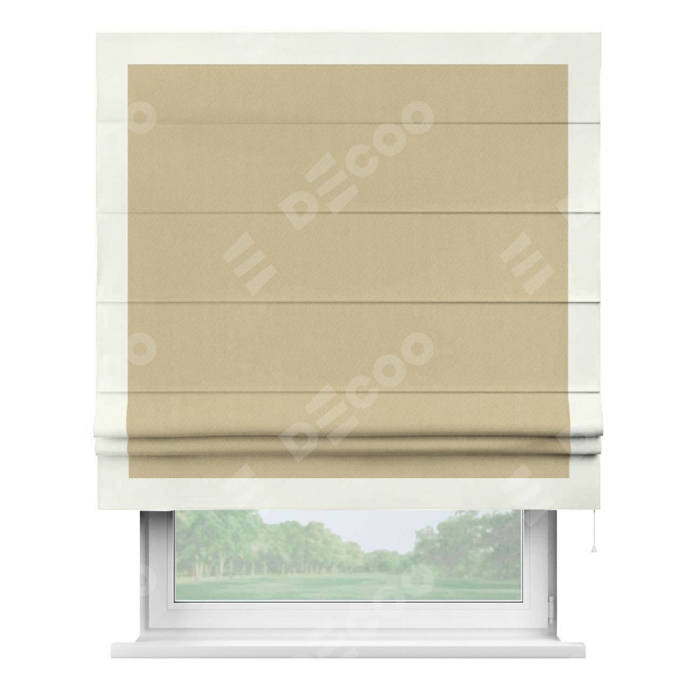 Римская штора производителя «Cortin», используется для проёма, пошита из ткани канвас бежевый, артикул ткани v-96. Отделка шторы кантом «Чесс» (молочный v-93), ткань для канта используется из канваса разной расцветки на выбор. Имеет универсальный механизм и подходит для монтажа: на потолок, на стену и в нишу.