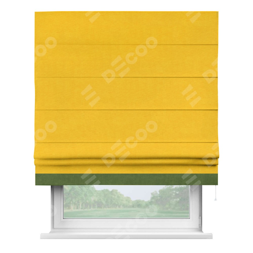 Римская штора производителя «Cortin», используется для проёма, пошита из ткани канвас желтый, артикул ткани v-344. Отделка шторы кантом «Джестер» (трава v-473), ткань для канта используется из канваса разной расцветки на выбор. Имеет универсальный механизм и подходит для монтажа: на потолок, на стену и в нишу.