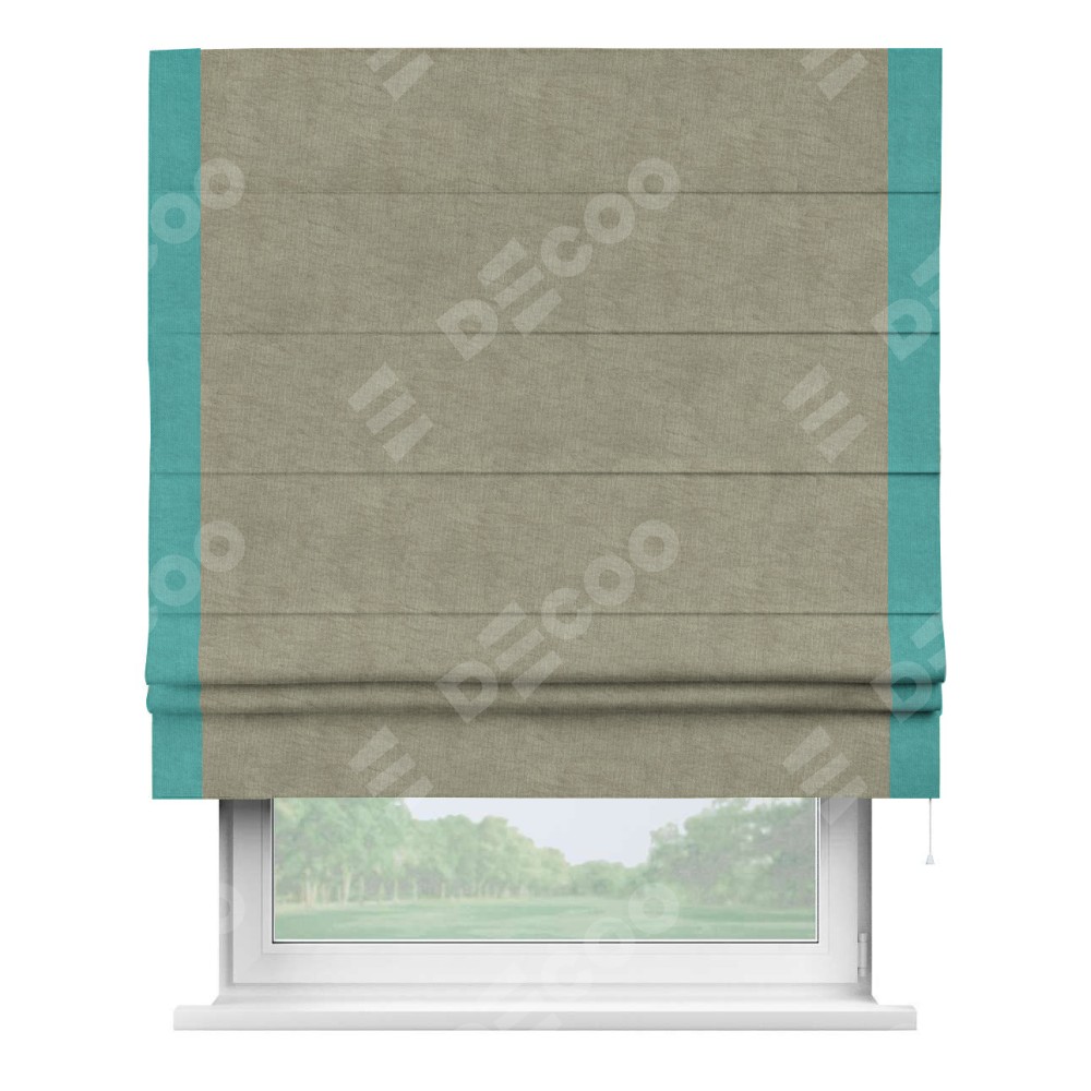 Римская штора производителя «Cortin», используется для проёма, пошита из ткани канвас капучино, артикул ткани v-211. Отделка шторы кантом «Стрим Дуо» (бирюзовый v-1048), ткань для канта используется из канваса разной расцветки на выбор. Имеет универсальный механизм и подходит для монтажа: на потолок, на стену и в нишу.