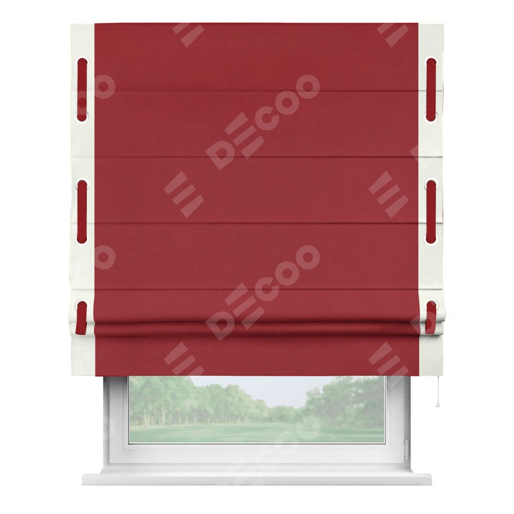 Римская штора производителя «Cortin», используется для проёма, пошита из ткани канвас красный, артикул ткани v-113. Отделка шторы кантом «Стрим Дуо» (молочный v-93) на кантах расположены люверсы с пояском, ткань для канта используется из канваса разной расцветки на выбор. Ткань для пояска обычно используется из основной ткани шторы, а так же можно сделать из любой расцветки по желанию. Имеет универсальный механизм и подходит для монтажа: на потолок, на стену и в нишу.