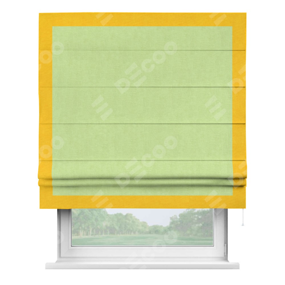 Римская штора производителя «Cortin», используется для проёма, пошита из ткани канвас липовый, артикул ткани v-207. Отделка шторы кантом «Чесс» (желтый v-344), ткань для канта используется из канваса разной расцветки на выбор. Имеет универсальный механизм и подходит для монтажа: на потолок, на стену и в нишу.