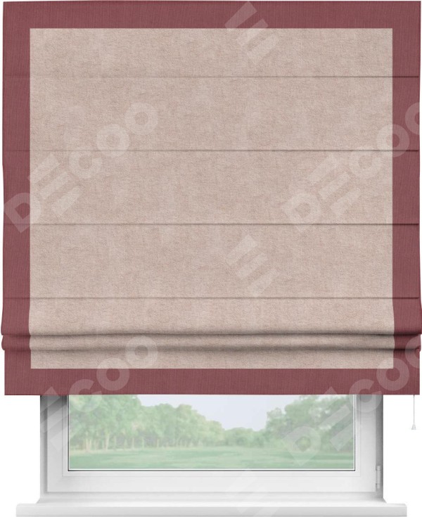 Римская штора производителя «Cortin», используется для проёма, пошита из ткани канвас пудровый, артикул ткани v-35. Отделка шторы кантом «Чесс» (ягодный v-28), ткань для канта используется из канваса разной расцветки на выбор. Имеет универсальный механизм и подходит для монтажа: на потолок, на стену и в нишу.