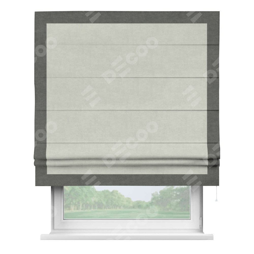 Римская штора производителя «Cortin», используется для проёма, пошита из ткани канвас светло-серый, артикул ткани v-371. Отделка шторы кантом «Чесс» (тёмно-серый v-340), ткань для канта используется из канваса разной расцветки на выбор. Имеет универсальный механизм и подходит для монтажа: на потолок, на стену и в нишу.