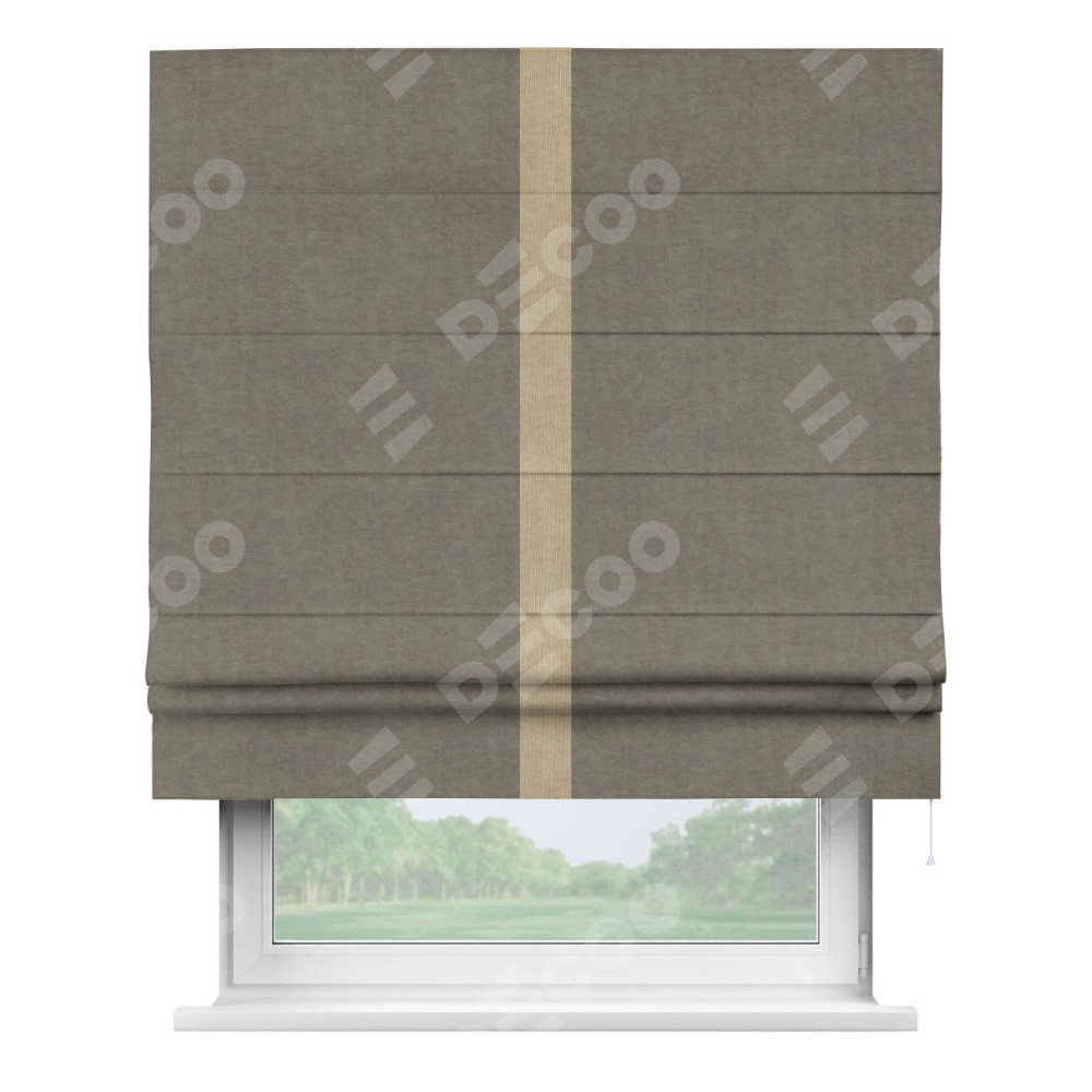 Римская штора производителя «Cortin», используется для проёма, пошита из ткани канвас серо-бежевый, артикул ткани v-224. Отделка шторы кантом «Хайвей» (кофе с молоком v-07), ткань для канта используется из канваса разной расцветки на выбор. Имеет универсальный механизм и подходит для монтажа: на потолок, на стену и в нишу.