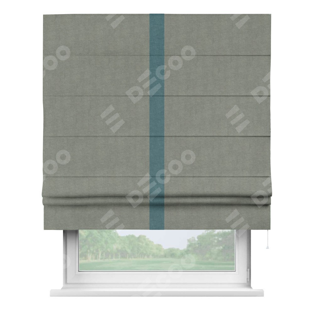 Римская штора производителя «Cortin», используется для проёма, пошита из ткани канвас сизый, артикул ткани v-1902. Отделка шторы кантом «Хайвей» (ментоловый v-114), ткань для канта используется из канваса разной расцветки на выбор. Имеет универсальный механизм и подходит для монтажа: на потолок, на стену и в нишу.