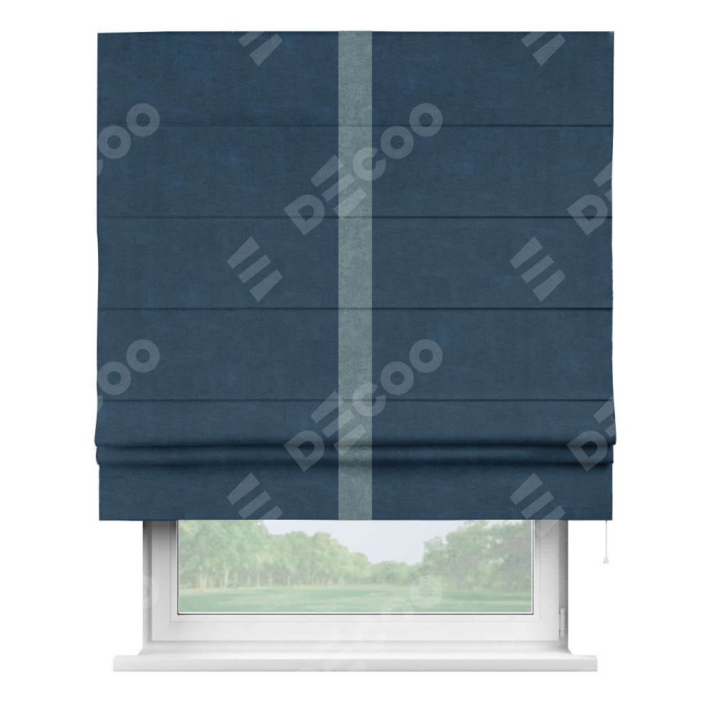 Римская штора производителя «Cortin», используется для проёма, пошита из ткани канвас синий, артикул ткани v-573. Отделка шторы кантом «Хайвей» (серо-голубой v-330), ткань для канта используется из канваса разной расцветки на выбор. Имеет универсальный механизм и подходит для монтажа: на потолок, на стену и в нишу.