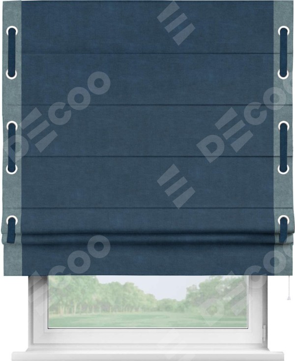 Римская штора производителя «Cortin», используется для проёма, пошита из ткани канвас синий, артикул ткани v-573. Отделка шторы кантом «Стрим Дуо» (серо-голубой v-330) на кантах расположены люверсы с пояском, ткань для канта используется из канваса разной расцветки на выбор. Ткань для пояска обычно используется из основной ткани шторы, а так же можно сделать из любой расцветки по желанию. Имеет универсальный механизм и подходит для монтажа: на потолок, на стену и в нишу.