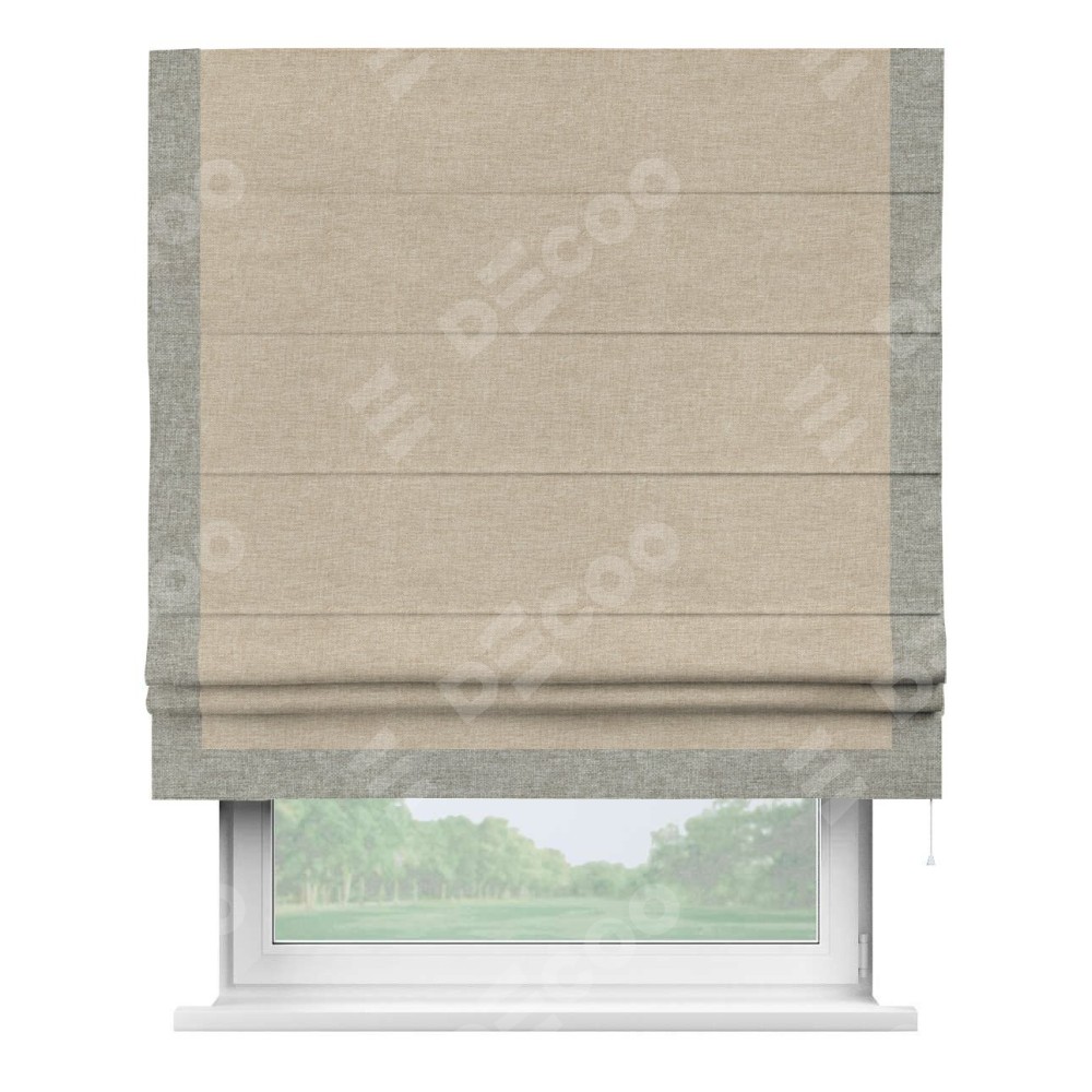 Римская штора производителя «Cortin», используется для проёма, пошита из ткани лён кашемир бежевый, артикул 17206. Отделка шторы кантом «Виктория», ткань для канта используется из льна разной расцветки на выбор. Имеет универсальный механизм и подходит для монтажа: на потолок, на стену и в нишу.