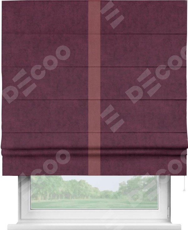 Римская штора производителя «Cortin», используется для проёма, пошита из ткани канвас фиолетовый, артикул ткани v-99. Отделка шторы кантом «Хайвей» (ягодный v-28), ткань для канта используется из канваса разной расцветки на выбор. Имеет универсальный механизм и подходит для монтажа: на потолок, на стену и в нишу.