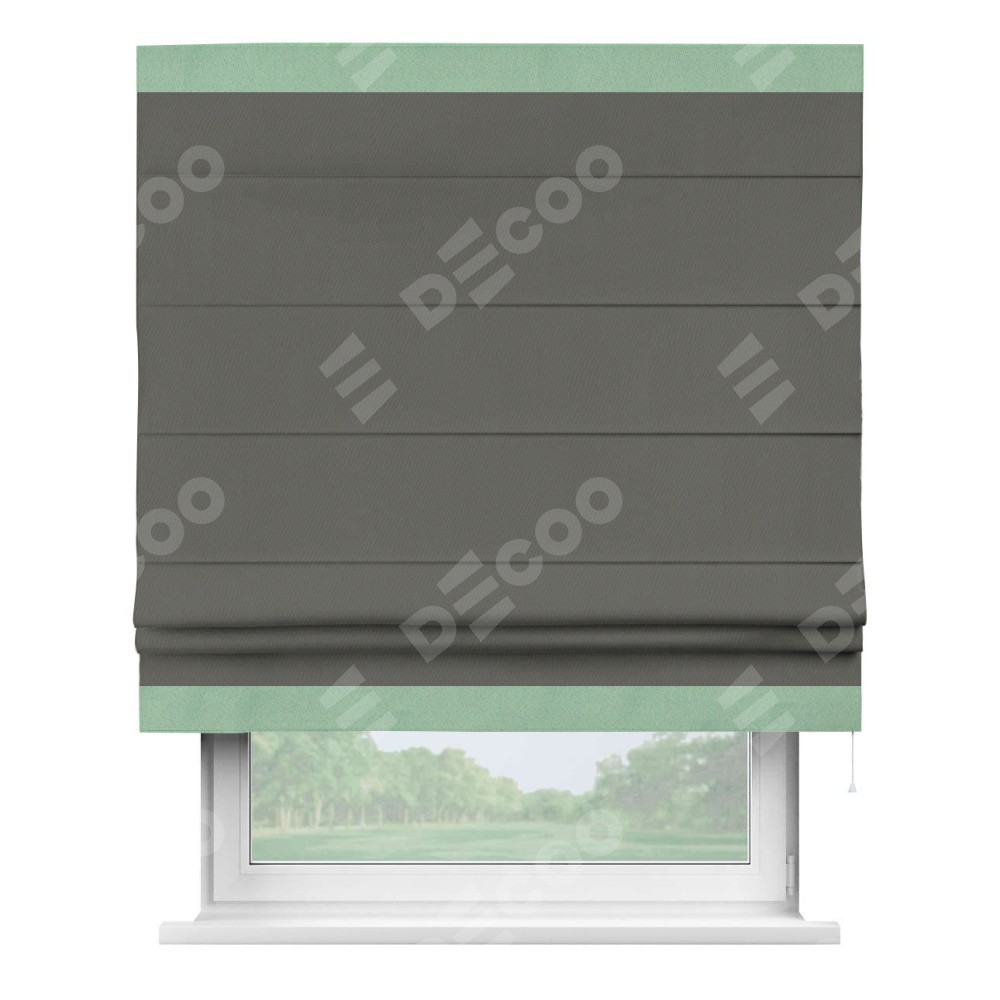 Римская штора производителя «Cortin», используется для проёма, пошита из ткани блэкаут однотонный тёмно-серый, артикул ткани 91570. Отделка шторы кантом «Горизонт», ткань для канта используется из блэкаута однотонного разной расцветки на выбор. Имеет универсальный механизм и подходит для монтажа: на потолок, на стену и в нишу.