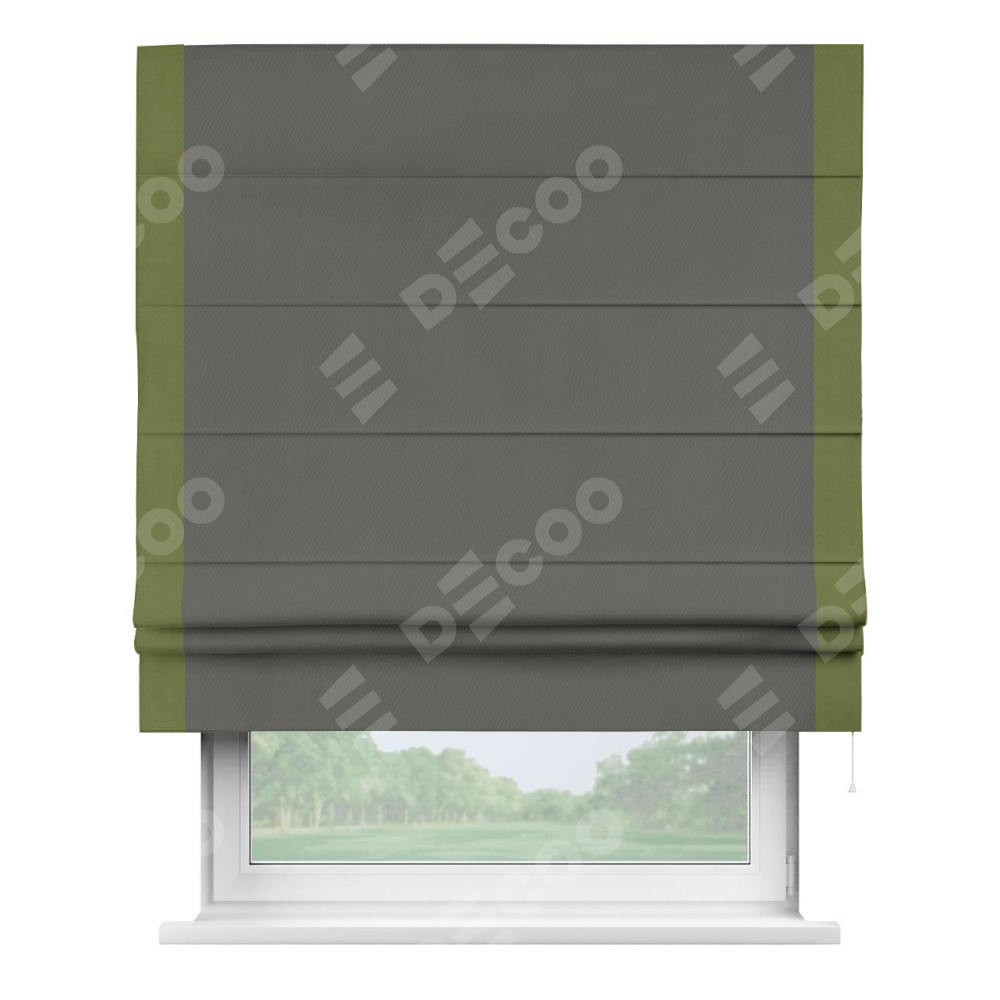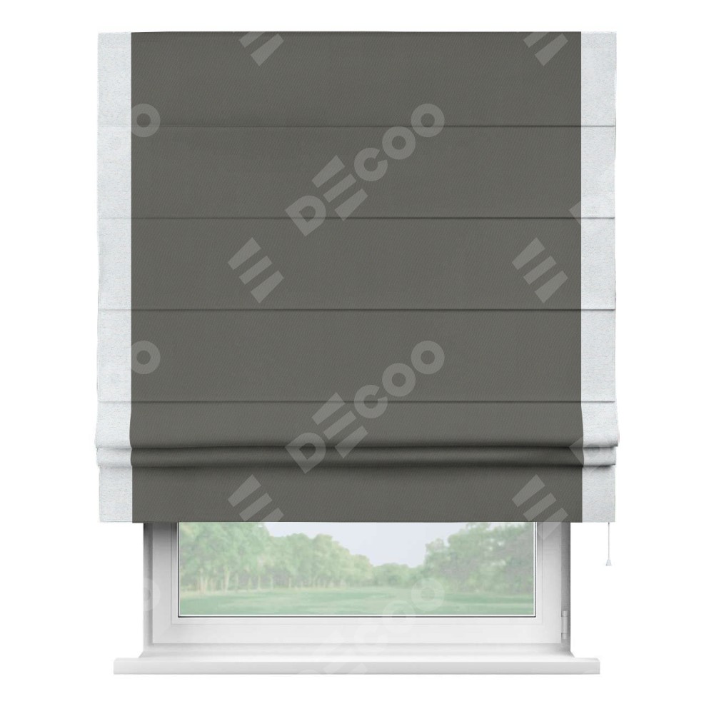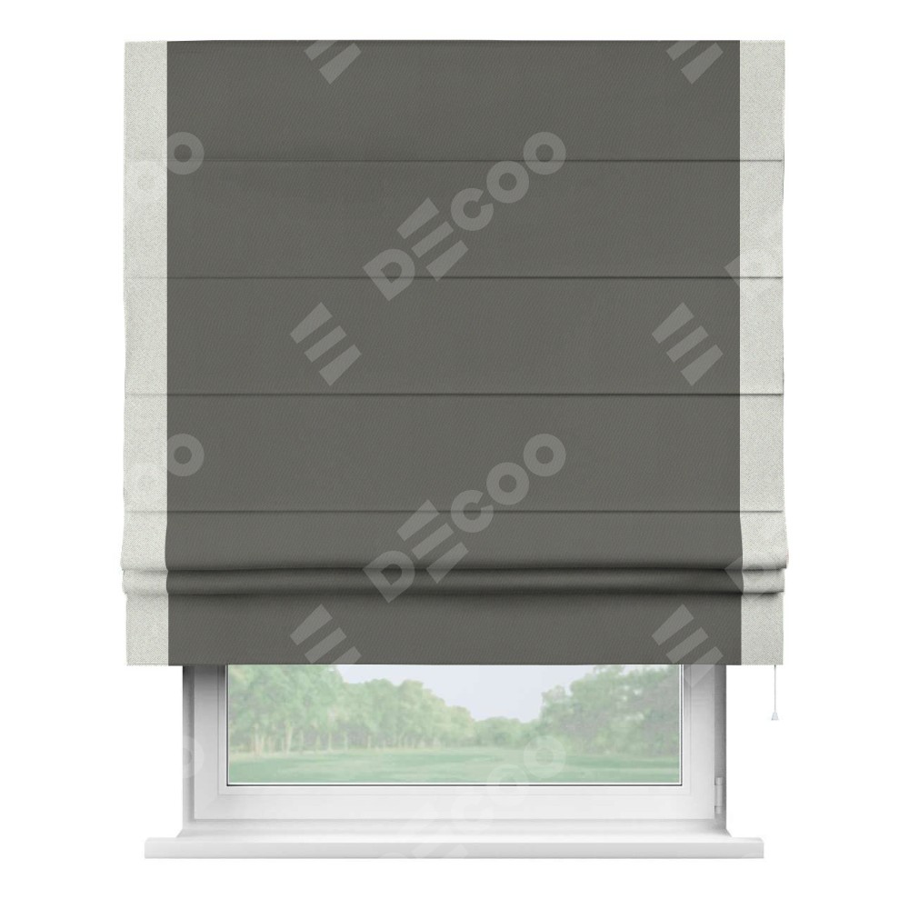Римская штора производителя «Cortin», используется для проёма, пошита из ткани блэкаут однотонный тёмно-серый, артикул ткани 91570. Отделка шторы кантом «Стрим Дуо», ткань для канта используется из блэкаута однотонного разной расцветки на выбор. Имеет универсальный механизм и подходит для монтажа: на потолок, на стену и в нишу.