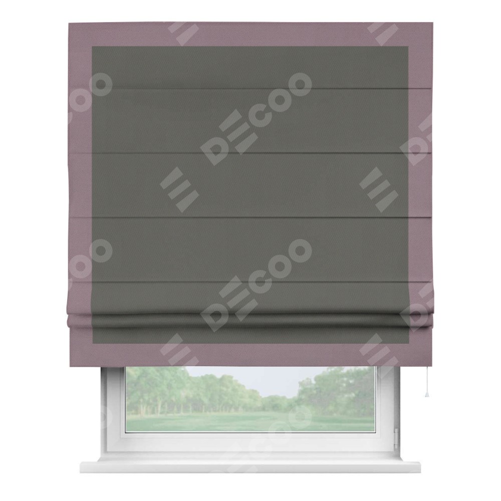 Римская штора производителя «Cortin», используется для проёма, пошита из ткани блэкаут однотонный тёмно-серый, артикул ткани 91570. Отделка шторы кантом «Чесс», ткань для канта используется из блэкаута однотонного разной расцветки на выбор. Имеет универсальный механизм и подходит для монтажа: на потолок, на стену и в нишу.
