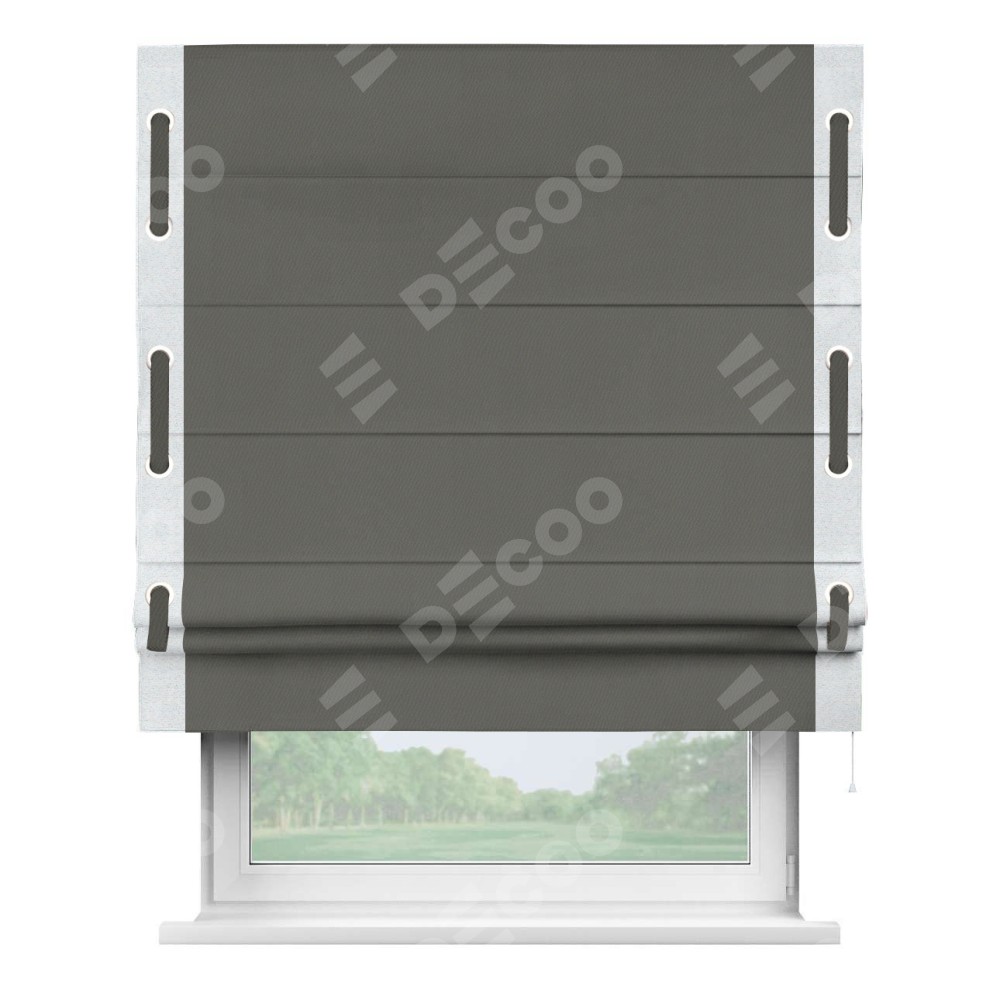 Римская штора производителя «Cortin», используется для проёма, пошита из ткани блэкаут однотонный тёмно-серый, артикул ткани 91570. Отделка шторы кантом «Стрим Дуо» на кантах расположены люверсы с пояском, ткань для канта используется из блэкаута однотонного разной расцветки на выбор. Ткань для пояска обычно используется из основной ткани шторы, а так же можно сделать из любой расцветки по желанию. Имеет универсальный механизм и подходит для монтажа: на потолок, на стену и в нишу.