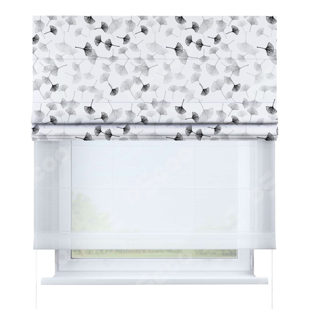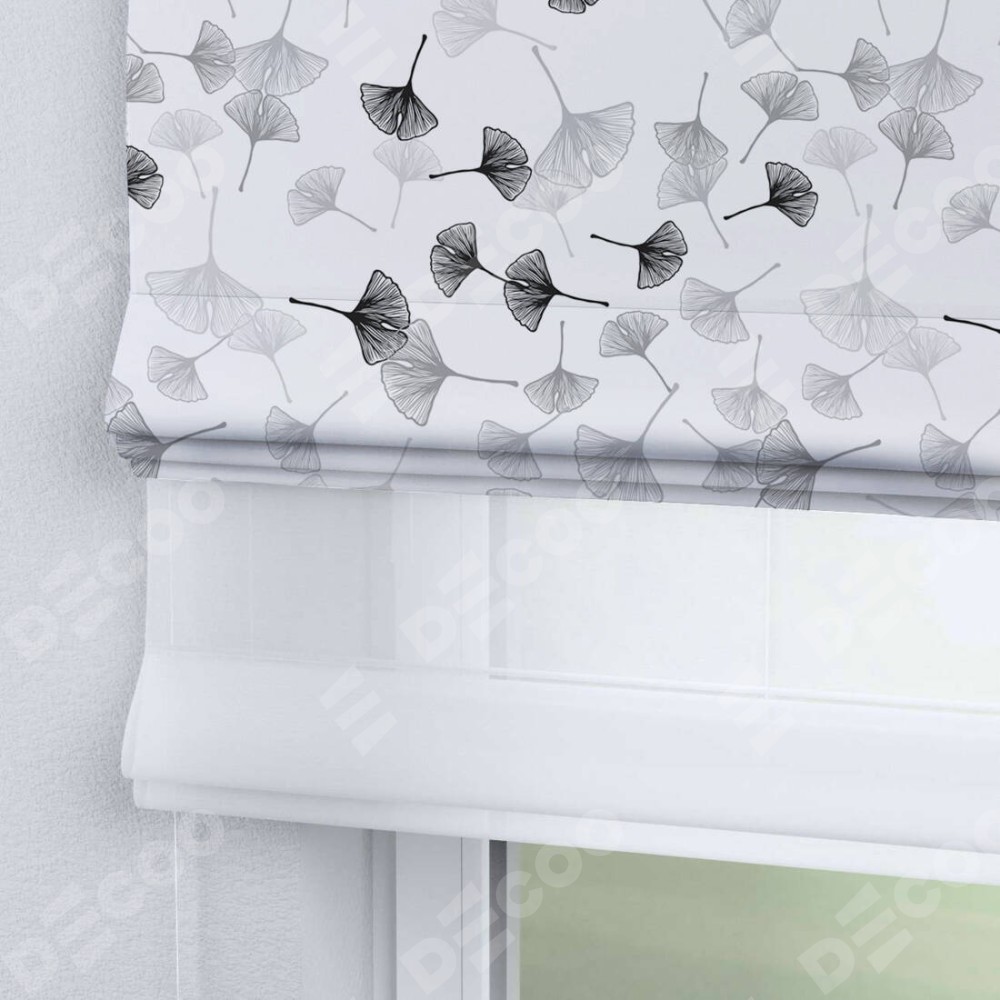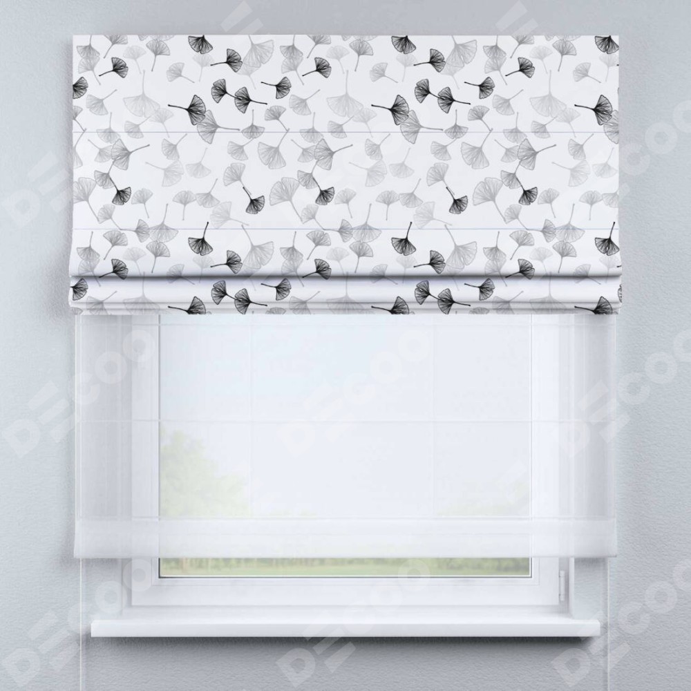 Двойная римская штора «День-ночь» от производителя Cortin предназначена для использования в проёмах. Эта штора уникальна тем, что состоит из двух полотен. На лицевой стороне находится блэкаут с нанесением сублимационной печати «Дымчатые листочки», обеспечивающий эффективное затемнение. В комплект также входит вторая ткань — легкий белый тюль (артикул: V-01), который добавляет изящества и легкости оформлению окна. Кроме того, доступны и другие разновидности ткани тюль, выбор которых доступен по  ссылке .