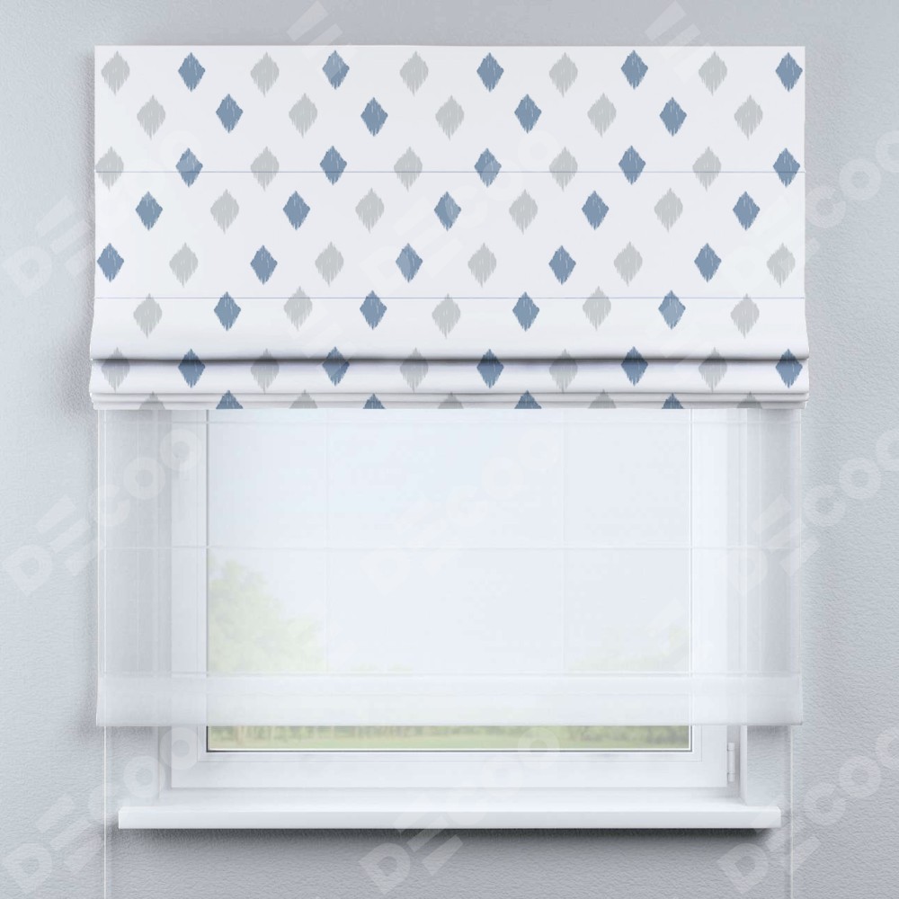 Двойная римская штора «День-ночь» от производителя Cortin предназначена для использования в проёмах. Эта штора уникальна тем, что состоит из двух полотен. На лицевой стороне находится блэкаут с нанесением сублимационной печати «Икат ромбики», обеспечивающий эффективное затемнение. В комплект также входит вторая ткань — легкий белый тюль (артикул: V-01), который добавляет изящества и легкости оформлению окна. Кроме того, доступны и другие разновидности ткани тюль, выбор которых доступен по  ссылке .