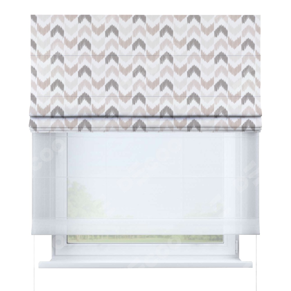 Двойная римская штора «День-ночь» от производителя Cortin предназначена для использования в проёмах. Эта штора уникальна тем, что состоит из двух полотен. На лицевой стороне находится блэкаут с нанесением сублимационной печати «Икат стрелки», обеспечивающий эффективное затемнение. В комплект также входит вторая ткань — легкий белый тюль (артикул: V-01), который добавляет изящества и легкости оформлению окна. Кроме того, доступны и другие разновидности ткани тюль, выбор которых доступен по ссылке .