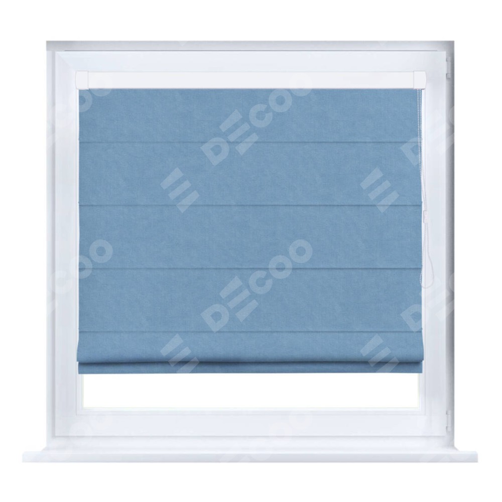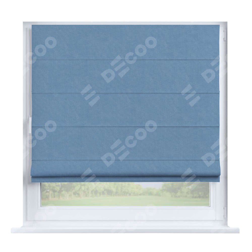 Римская штора производителя «Cortin», устанавливается на створку окна, пошита из ткани канвас голубой, артикул 92729. Штора шьётся по индивидуальным размерам, для данного типа римской шторы возможная ширина от 35 до 150 см., высота до 250 см.