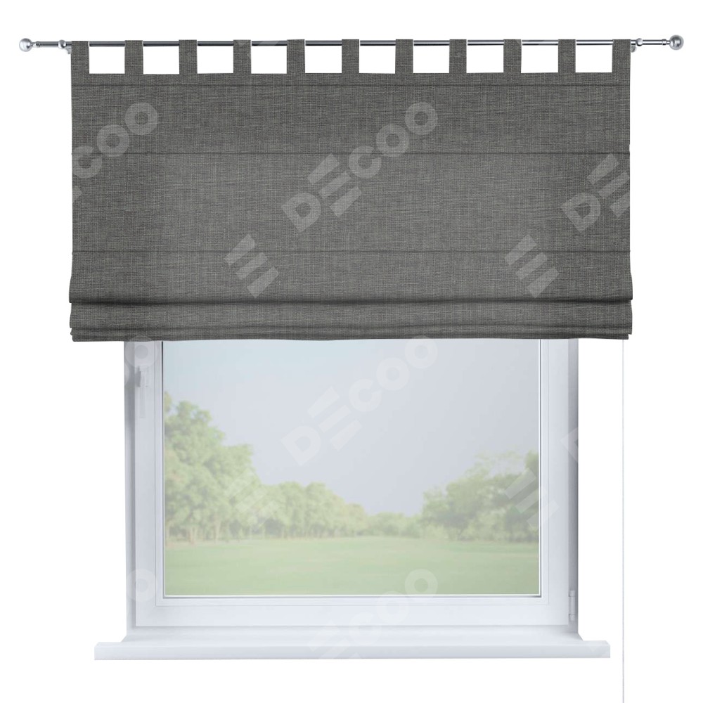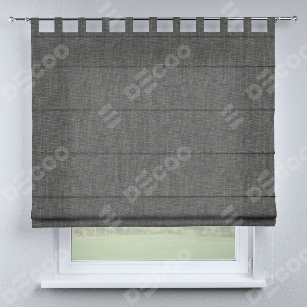Римская штора производителя «Cortin», используется для проёма, пошита из ткани лён тёмно-серый, артикул ткани 7441. Данная модель пошита на петлях, комплектуется на выбор круглым карнизом и подходит для монтажа на стену. Римская штора на петлях имеет простую систему регулировки высоты, отличительным преимуществом данной модели является простой способ монтажа. Достаточно повесить ее на трубу и штора готова!