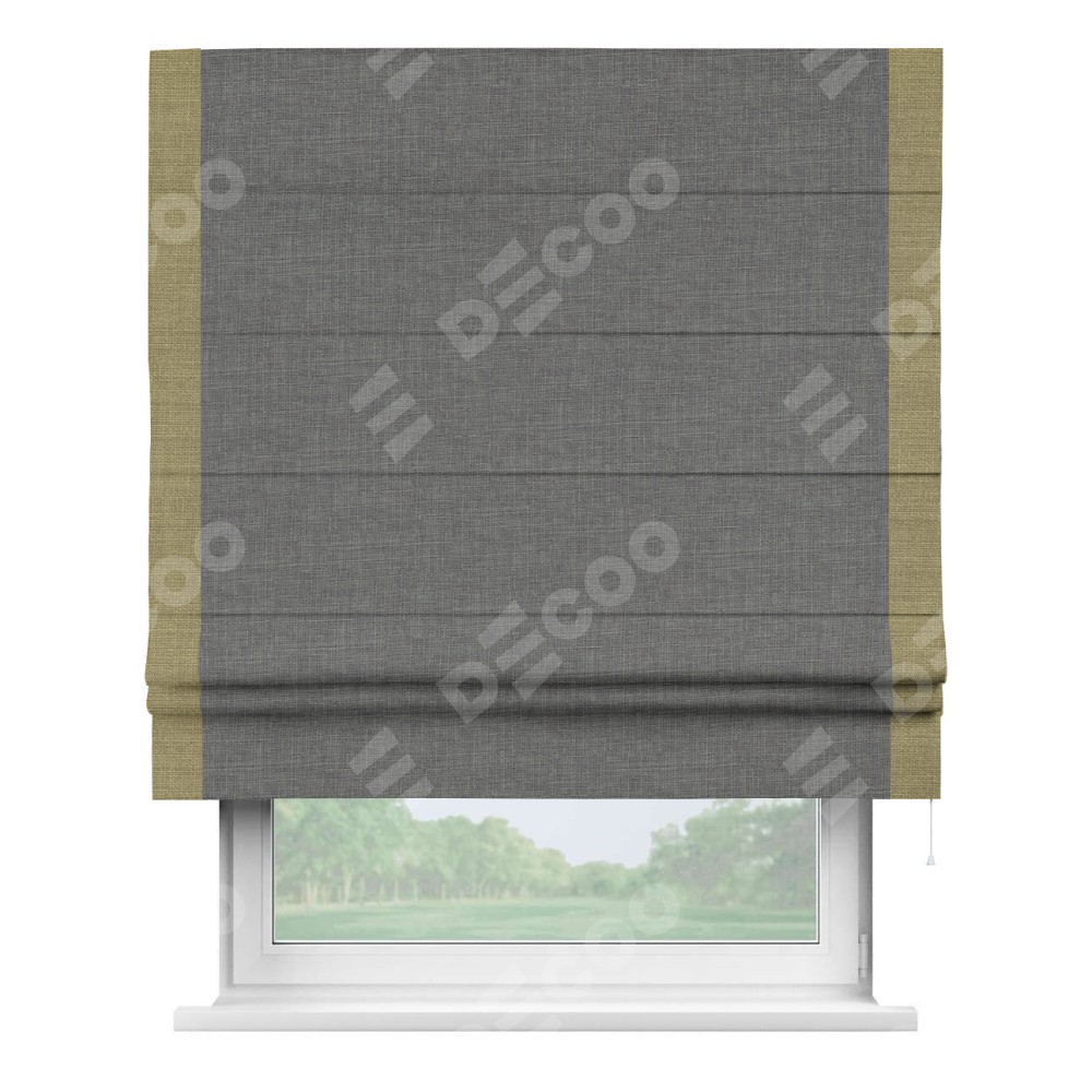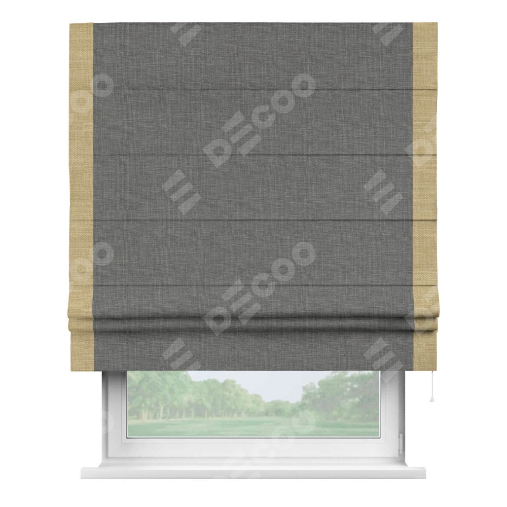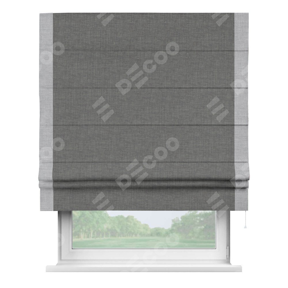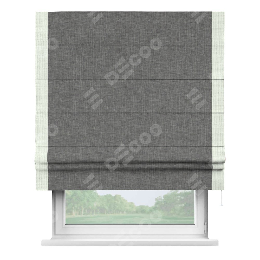 Римская штора производителя «Cortin», используется для проёма, пошита из ткани лён тёмно-серый, артикул 7441. Отделка шторы кантом «Стрим Дуо», ткань для канта используется из льна разной расцветки на выбор. Имеет универсальный механизм и подходит для монтажа: на потолок, на стену и в нишу.