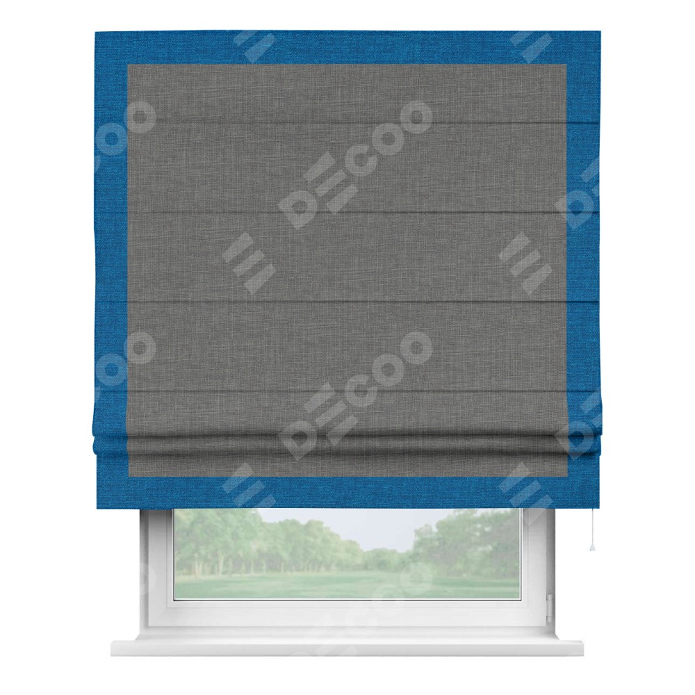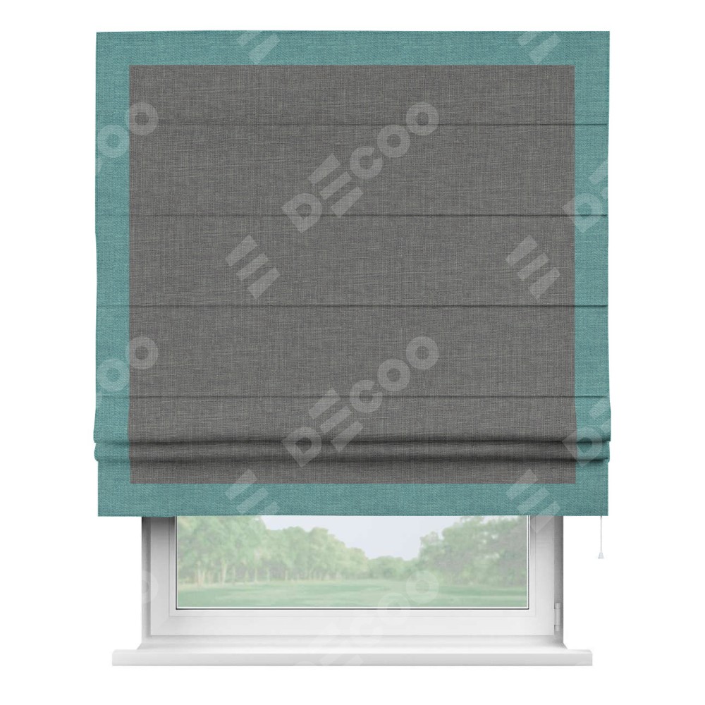 Римская штора производителя «Cortin», используется для проёма, пошита из ткани лён тёмно-серый, артикул 7441. Отделка шторы кантом «Чесс», ткань для канта используется из льна разной расцветки на выбор. Имеет универсальный механизм и подходит для монтажа: на потолок, на стену и в нишу.