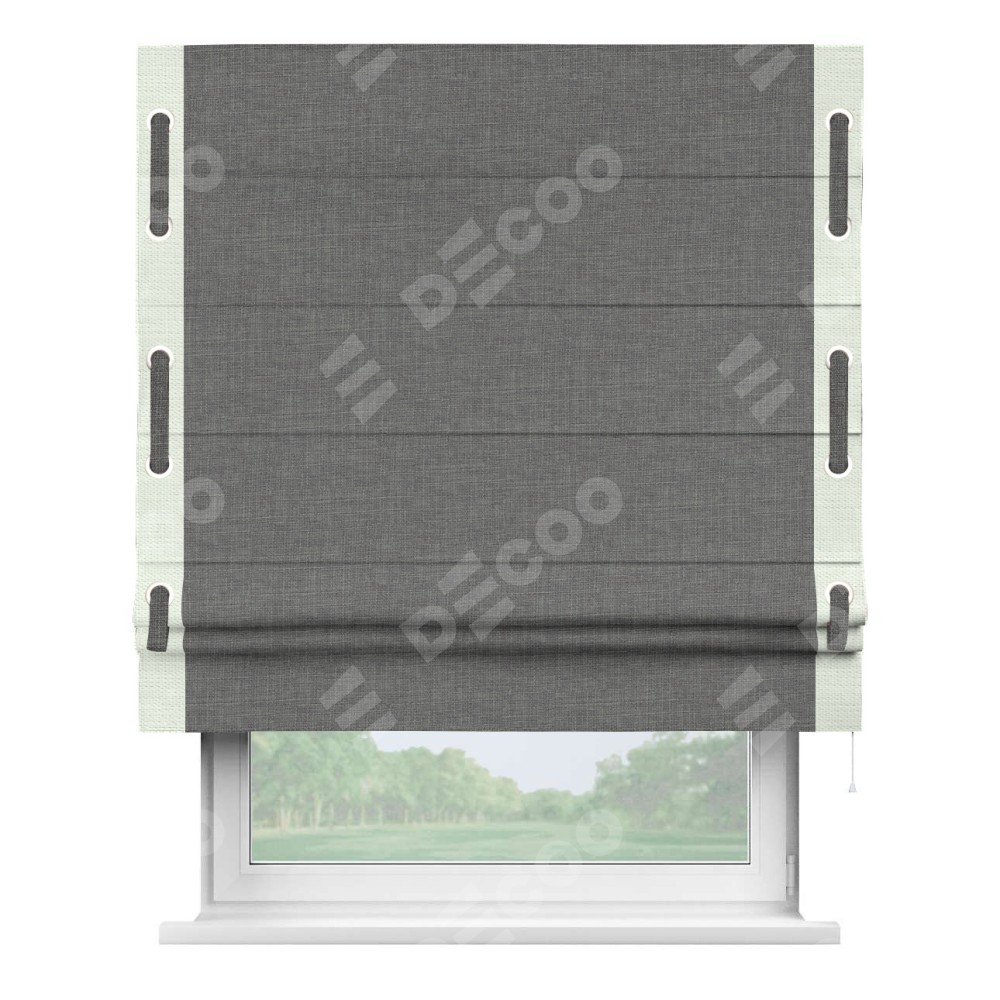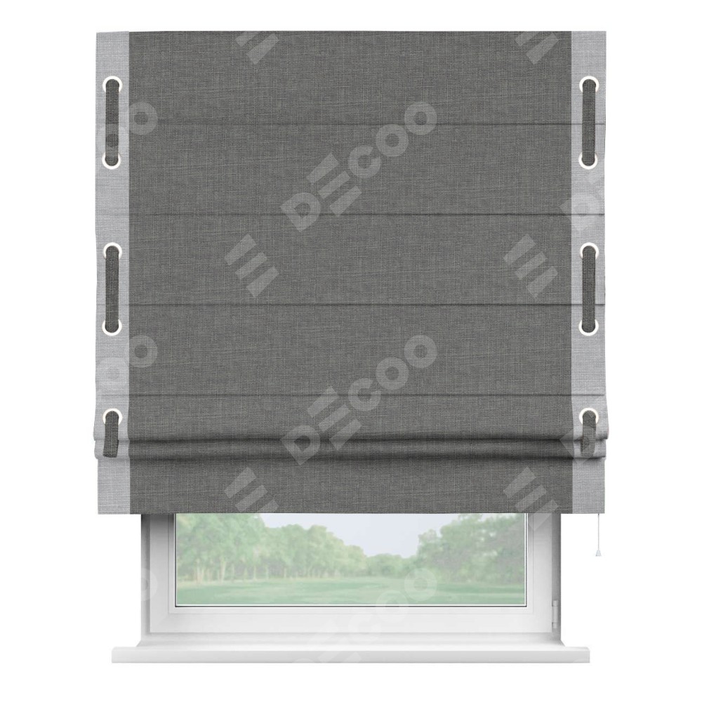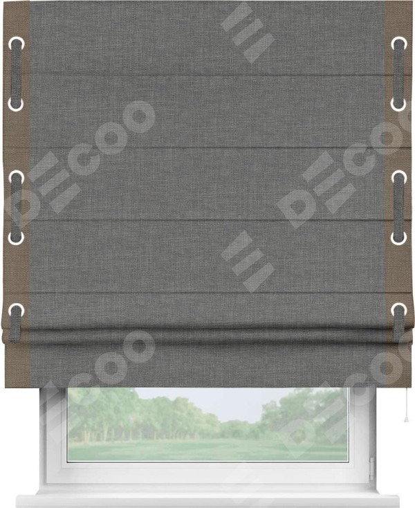 Римская штора производителя «Cortin», используется для проёма, пошита из ткани лён тёмно-серый, артикул 7441. Отделка шторы кантом «Стрим Дуо» на кантах расположены люверсы с пояском, ткань для канта используется из льна разной расцветки на выбор. Ткань для пояска обычно используется из основной ткани шторы, а так же можно сделать из любой расцветки по желанию. Имеет универсальный механизм и подходит для монтажа: на потолок, на стену и в нишу.